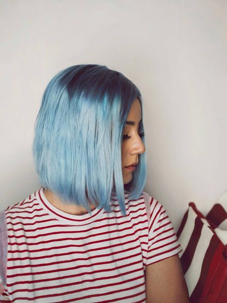 This cut and shade of blue hair color are perfect for ladies wanting to make a bold statement. This pastel blue will fade true to the tone and then back to an icy blonde, which is great for low-maintenance women looking for a quick transformation. Remember that the color will only last a few weeks before washing out.