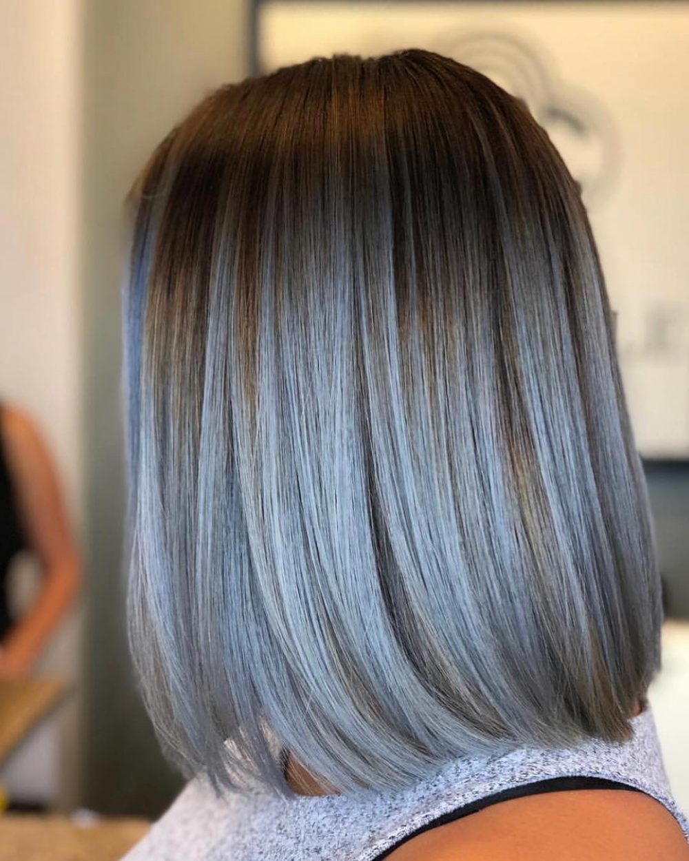Get into the vibe with these baby blue ombre strands! Painted on a sleek straight mid-length mane, Stylist Anna perfected this delicate ombre blue tone!
