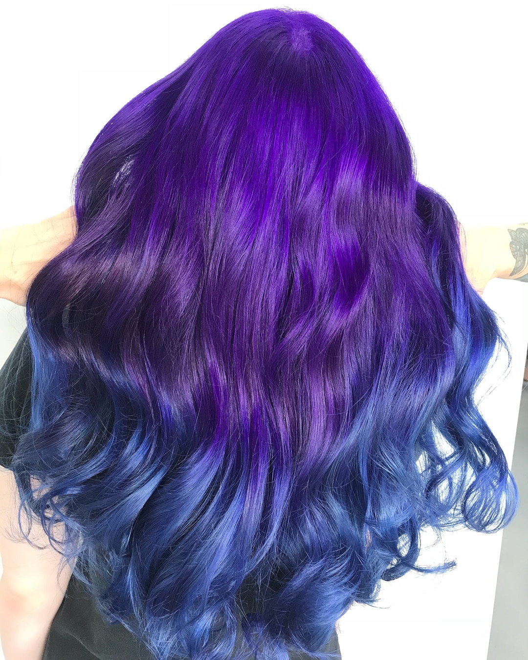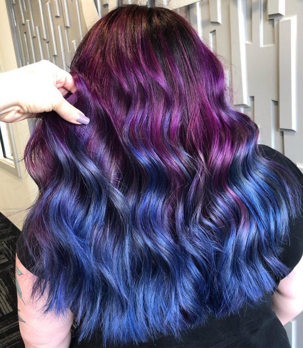 Explore this deep purple to denim blue ombre hair concept on long, wavy locks! This stunning creation possesses a galaxy vibe, brimming with vivid hues—the splashes of blue and purple harmonize beautifully. Begin to transform your look and choose such ombre hair shades!