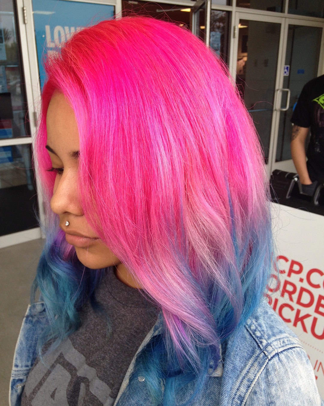 This vibrant pink-purple-blue ombre is one-of-a-kind, colorful, and playful! It was crafted by hairstylist Lauryn Lee of Encino, CA.