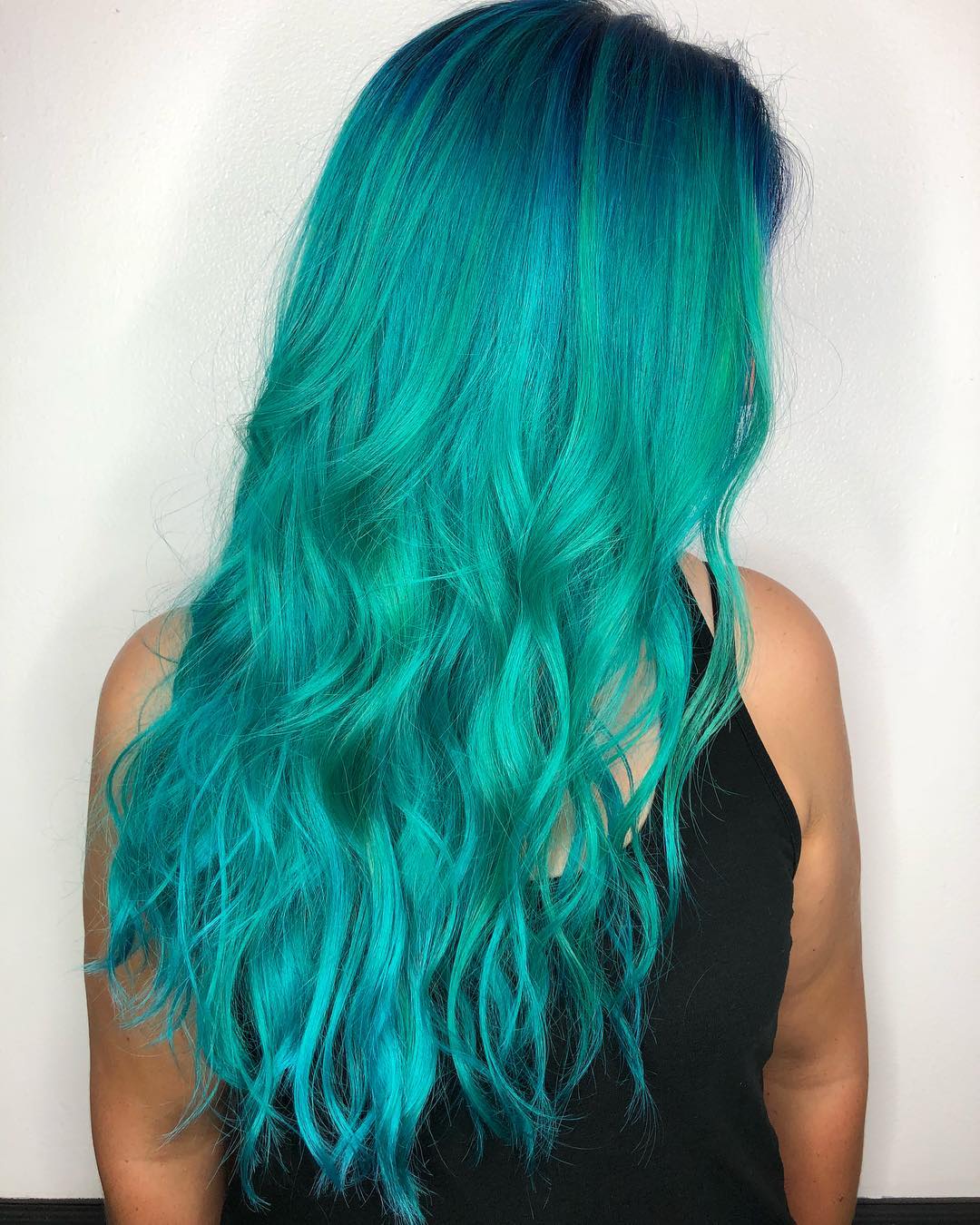 Look at this stunning shade of blue hair! Colorist Alexa created a beautiful color melt using natural brunette hair as a foundation and seamlessly blended it into a mermaid blue cyan ombre that beautifully enhances those long waves.