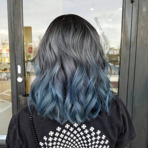 Allow a silver to blue ombre to enhance a mid-length haircut. This contemporary grey-blue ombre hair color can achieve a more textured effect from a wavy style. The movement does something wonderful to the shades. This is one of the finest blue hair styles to wear as you embrace that icy queen title while looking stunning!