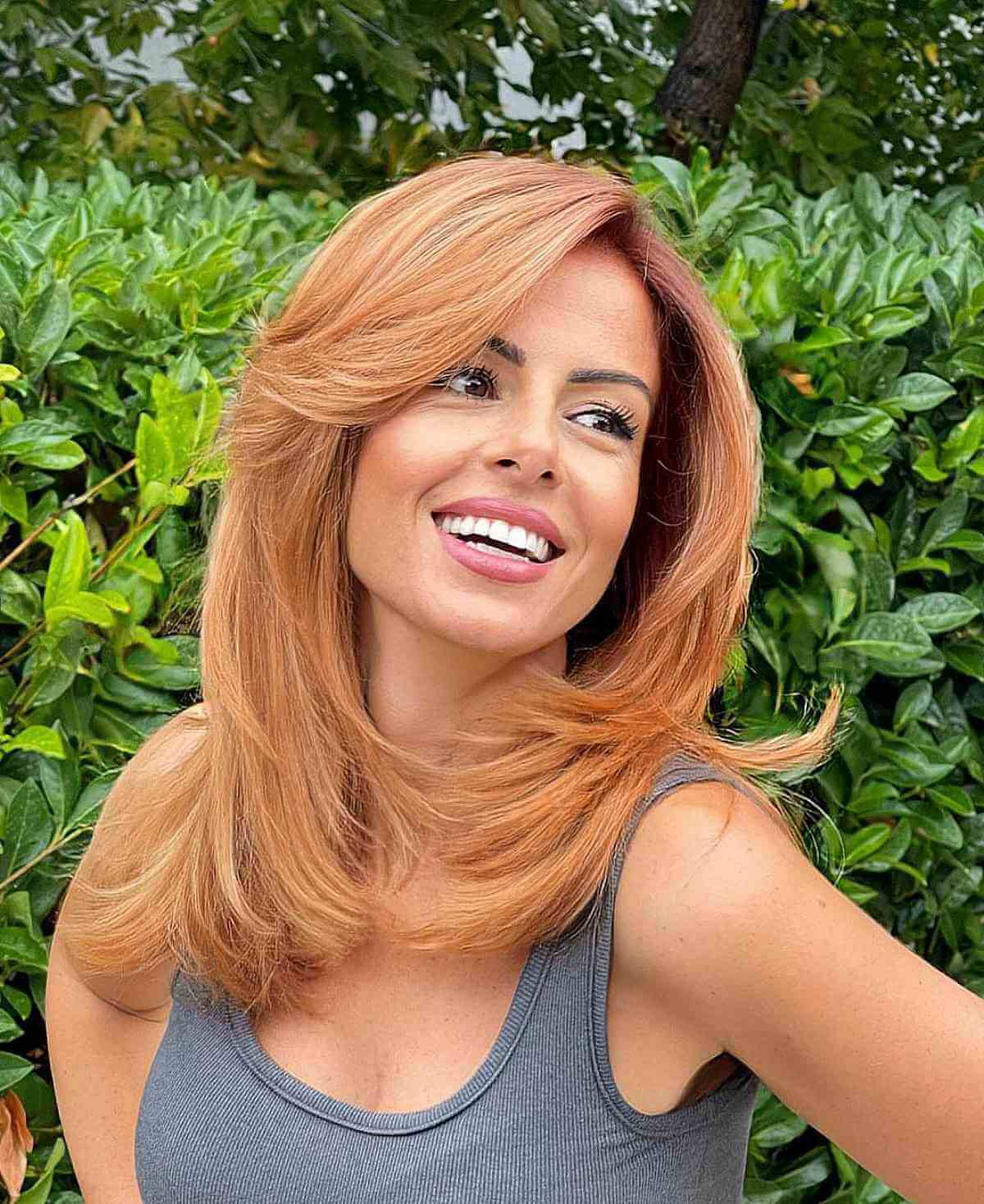 One of the most stylish looks for thick hair is cascading side bangs. To achieve that feathered effect, use a large round brush and velcro rollers to set the style. This season’s most fashionable color is a chic light copper. It not only complements the style but can also be tailored to suit your complexion.
