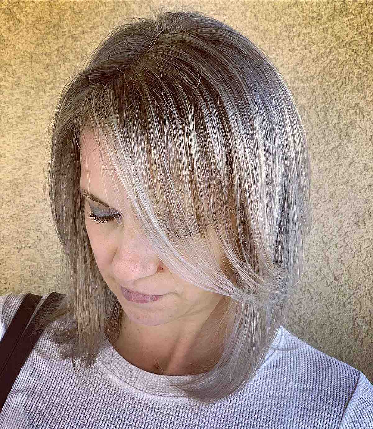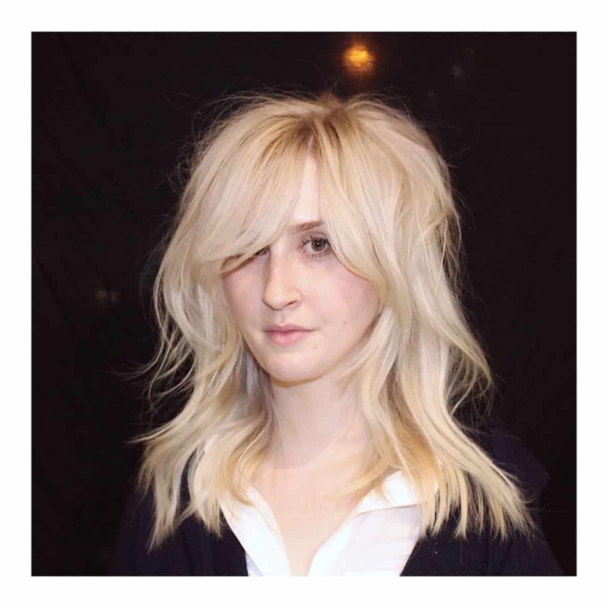 Explore a hairstyle featuring a light blonde highlighted, side-swept bangs. Incorporating highlights into your hair can elevate your personal style by introducing contrast and depth. If your face shape is long, pear, or round, long side bangs with a deep part flowing across your face would be an ideal option.