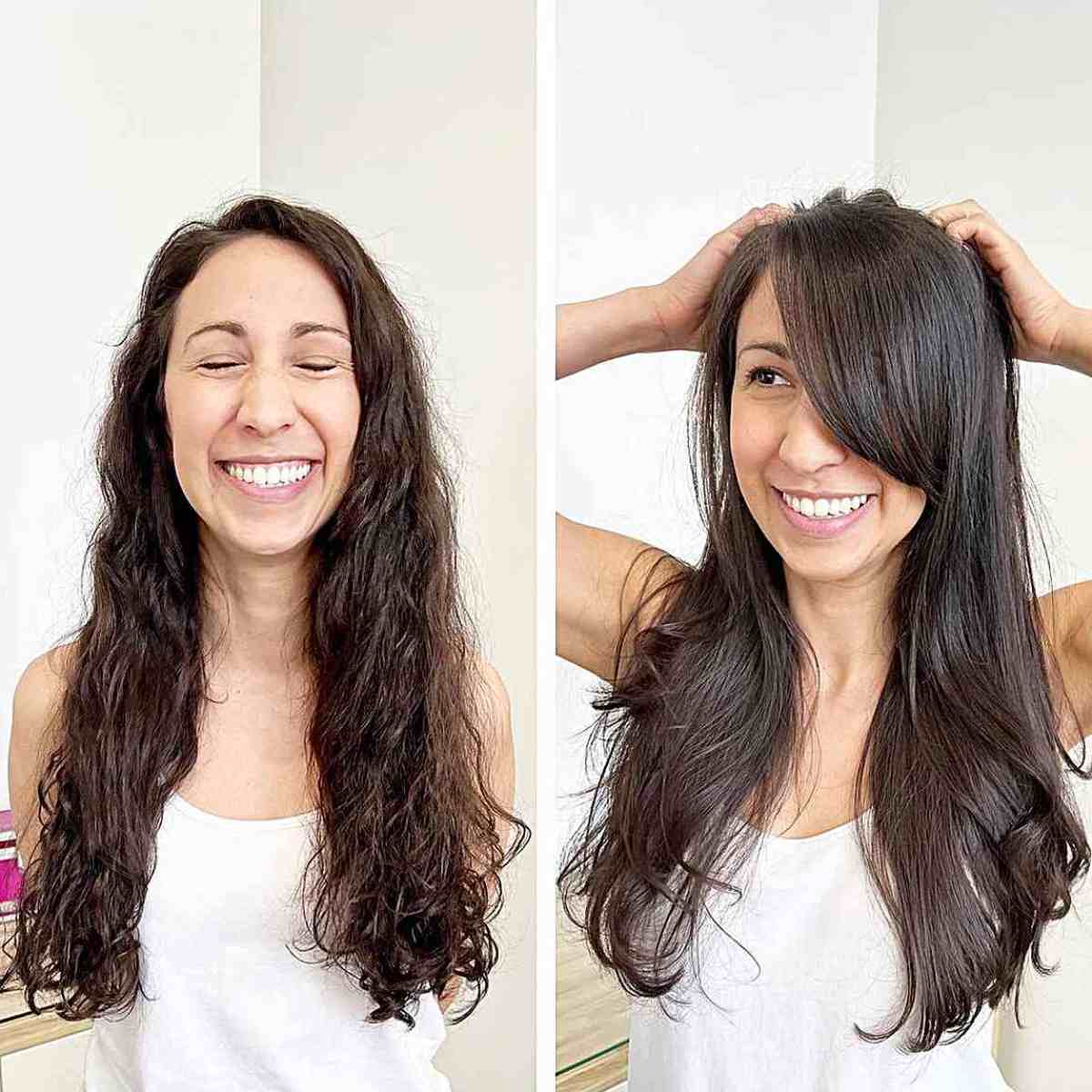 Long hair can appear uniform due to its similar look after any cut. Altering the hair style can offer diversity. You can style your natural curls or smooth your hair. Next, incorporate gentle bangs that frame the face and seamlessly blend with your longer layers. Long layers provide volume to fine or thin hair. They retain enough weight, keeping the hair feeling full and airy.