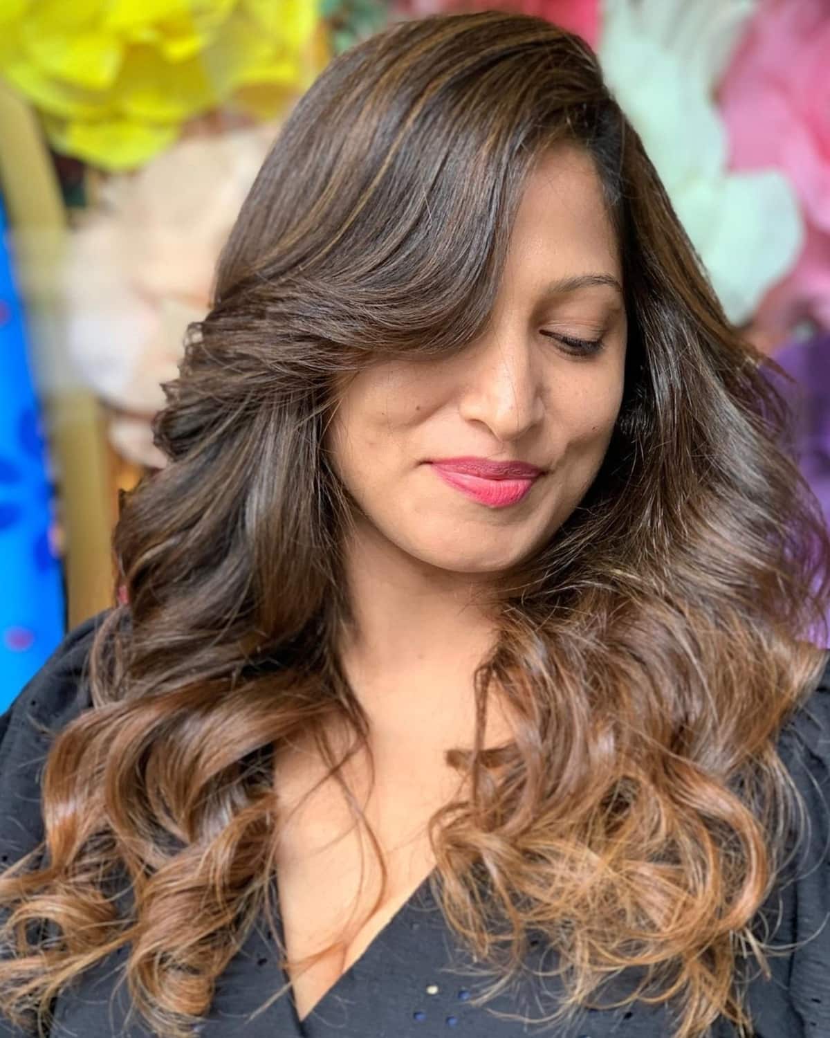 Try elegant balayage hair with extended bangs if you want a timeless look. One of the simplest ways to achieve this style is to curl your hair and brush the curls out. Use a finishing product that is best for locking in your style so it holds all day!