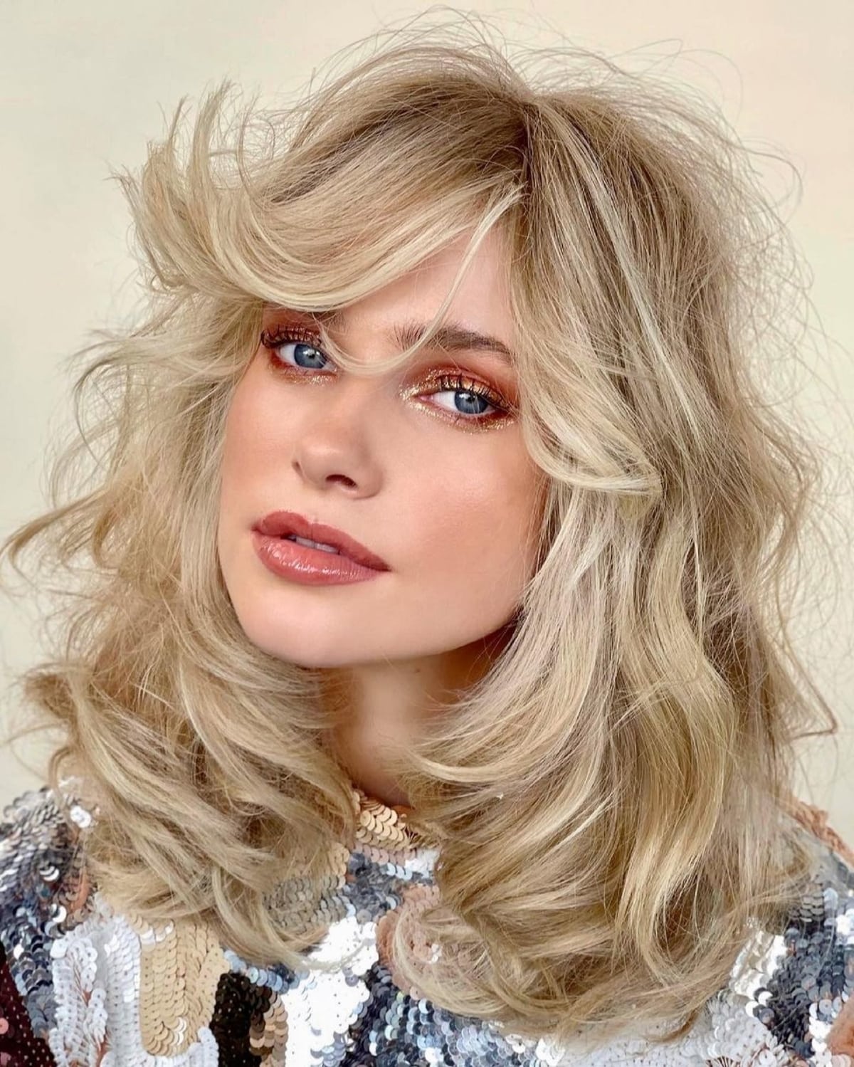 Choose flowing layered hair with side bangs and enhance it with plenty of waves for added movement and volume.