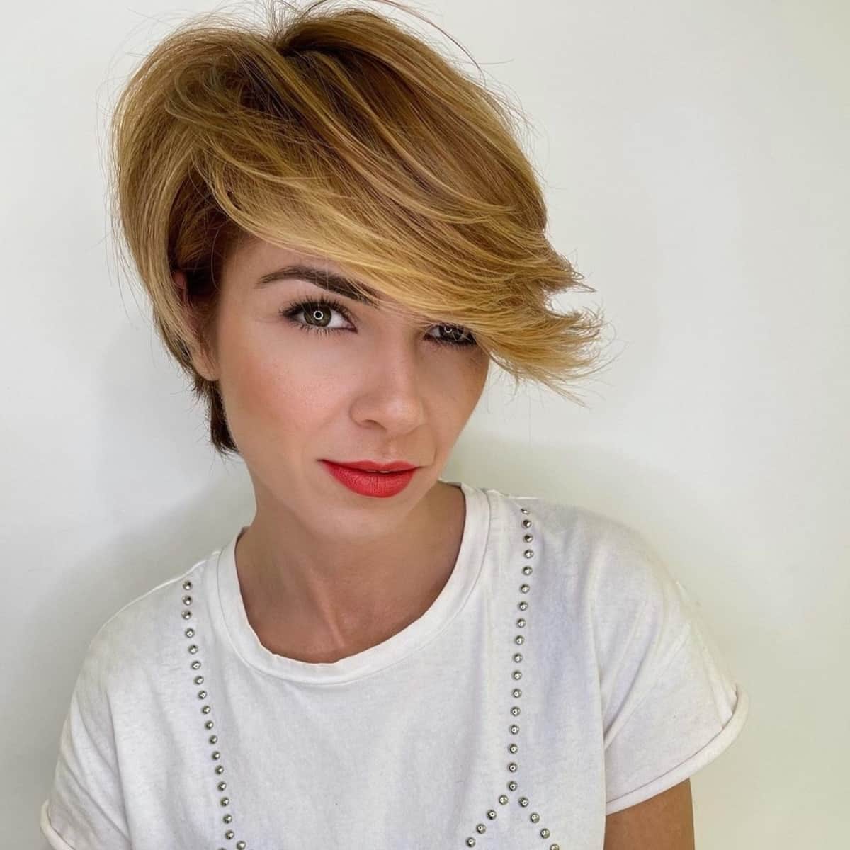 Extended Pixie Cut Featuring Side Bangs and a Side Part