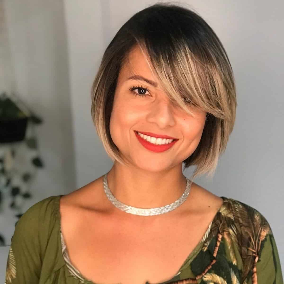 Long side bangs designed for round face shapes can be achieved without making your face appear rounder on a shorter styled chin-length cut. Ask your stylist to maintain the length on the sides just below the chin area. To elongate the face, you can request your stylist to refrain from adding any additional face-framing layers other than side-swept bangs cut above the brows.