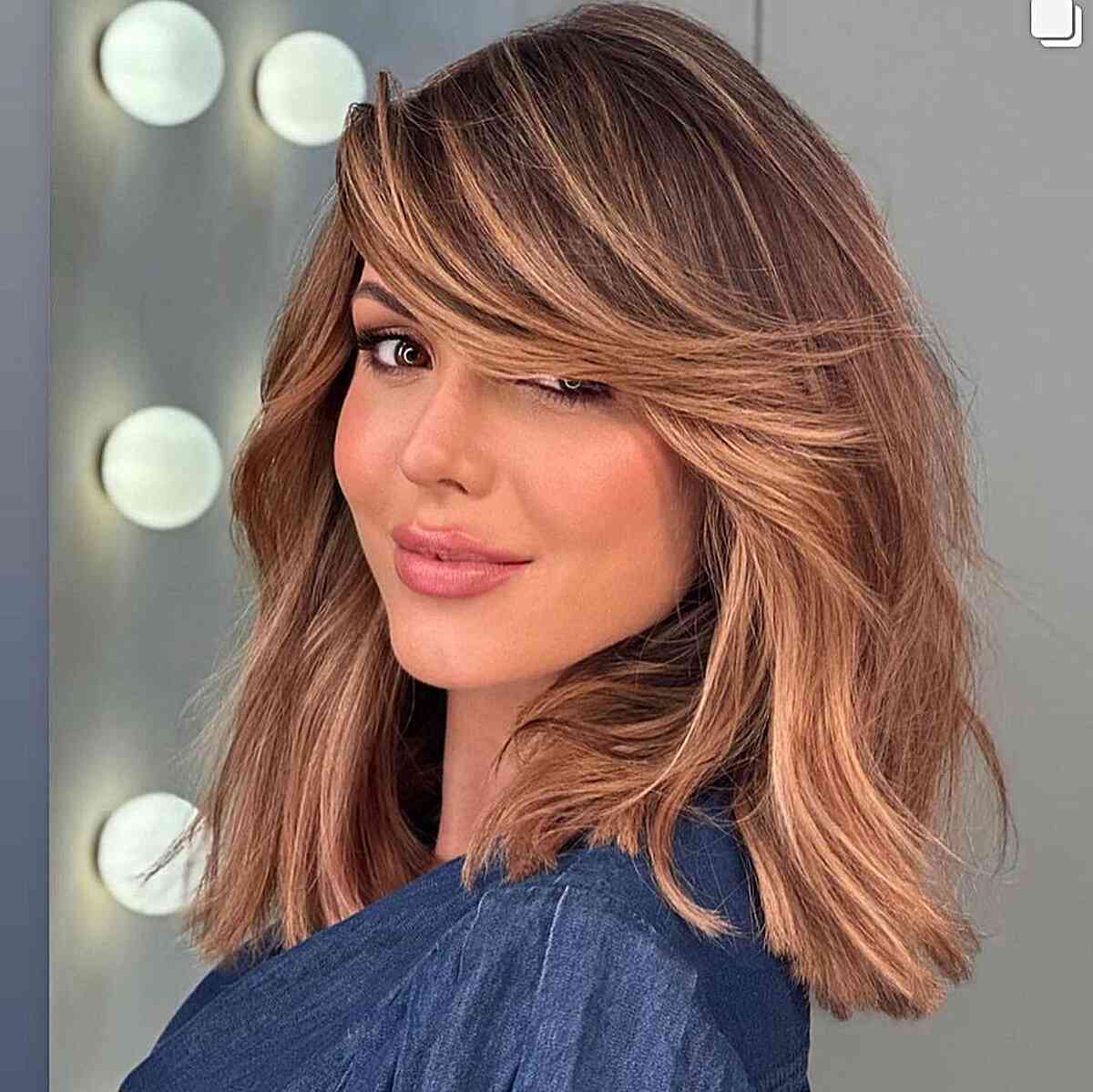 Achieve a medium length hairstyle with sheer bangs. By incorporating bangs, you can transform the appearance of your medium-length hair. If you’re hesitant about fuller bangs, consider a light side bang. Side bangs beautifully accentuate your face and can be effortlessly pinned back. You can also grow them out swiftly if you prefer to transition back to a no-bangs style.
