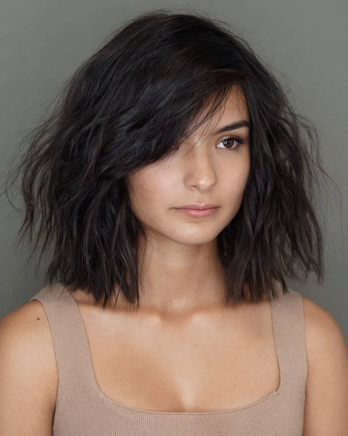 Opt for a long layered jagged bob with side bangs if you enjoy a tousled texture in your hair. The extended layers add an airy feel and amplify the width of the bob, enhancing the texture in your wavy locks. Side bangs are a fantastic touch to provide added shape and movement around the face while maintaining longer layers.