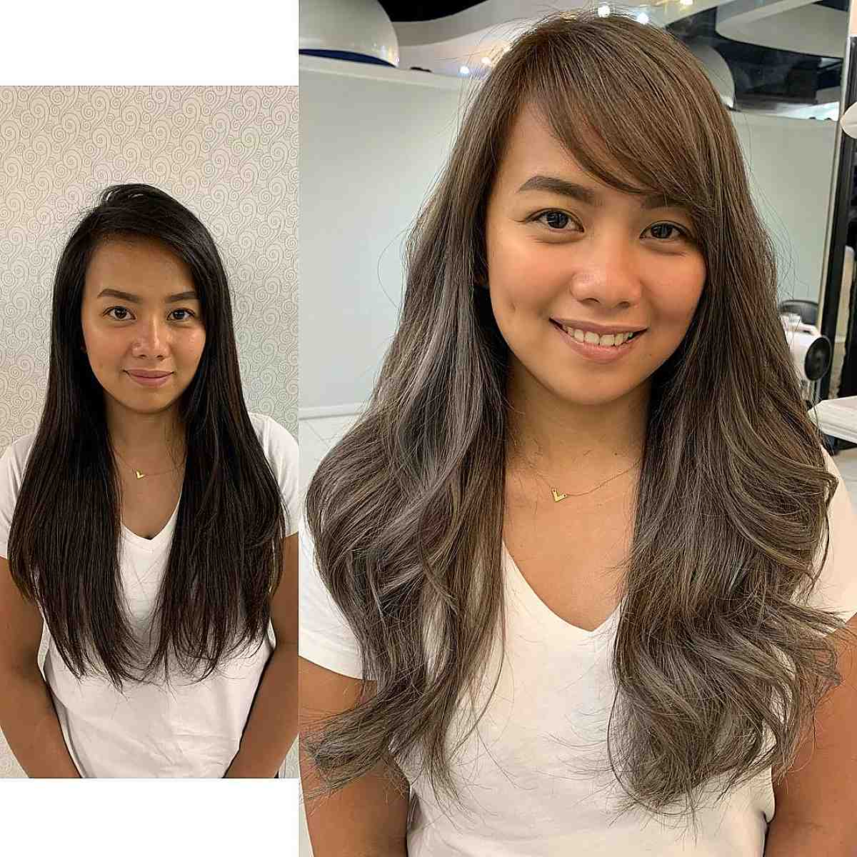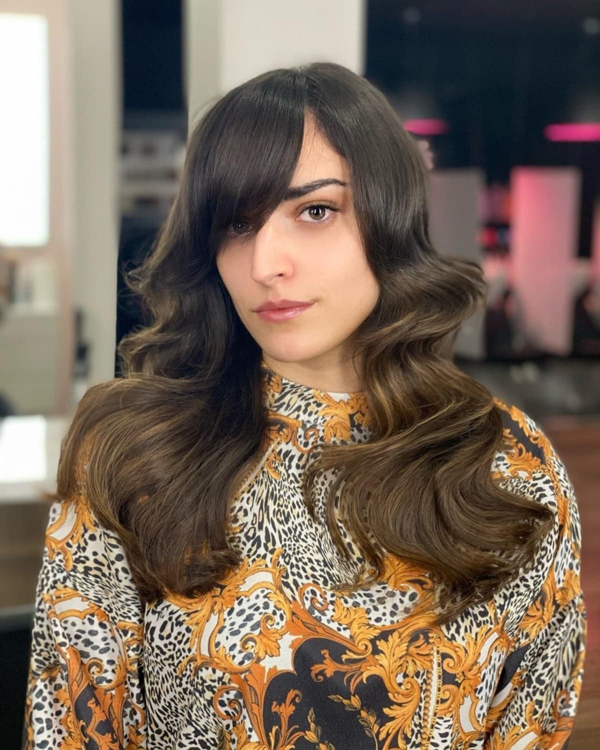 Consider long side-swept bangs to elevate your long hair. Request your stylist to trim your bangs to the lip or nose for an ideal length. These extended bangs complement all face shapes and impart a chic touch to the overall look. Blow-dry or curl away from your face for a gentle finish.
