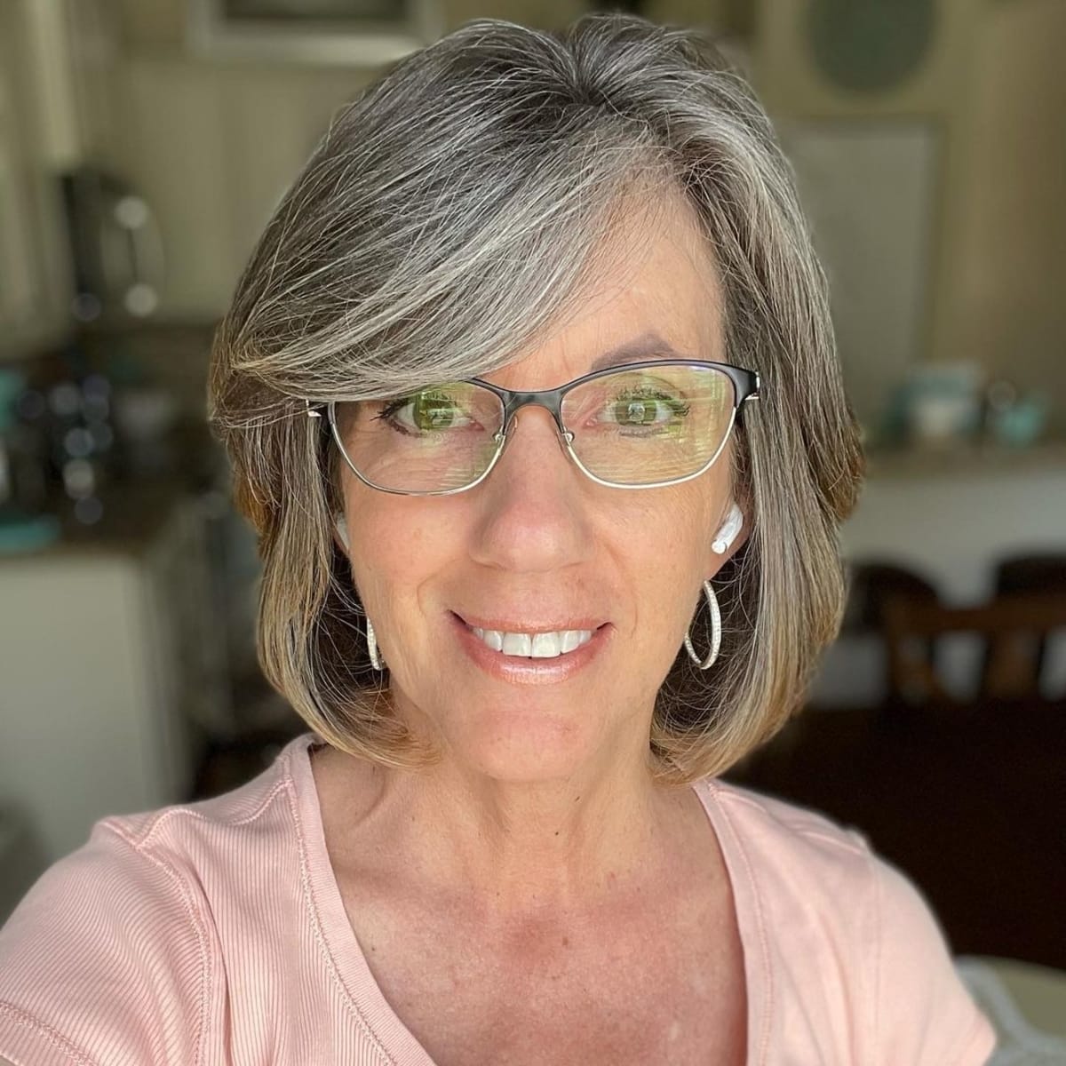 Stylish side bangs for women over 50 with glasses is a must-try hairstyle to soften and disguise any areas of recession. The hairline near our temples tends to become lighter with age. Giving some long movement to this area draws the eye to the mid-face and away from the forehead. The longer length in bangs also hits the sweet spot at your cheekbones for a youthful-looking appearance.