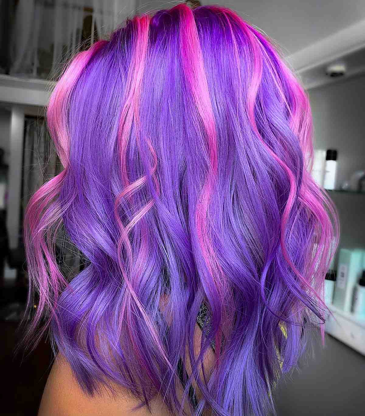 A pink and purple hair color is a unique blend that showcases shades of both pink and purple, often seen in the form of highlights or an ombre. This is your perfect opportunity to flaunt a whimsical two-toned or half-and-half hairstyle for all you fun-loving girls!