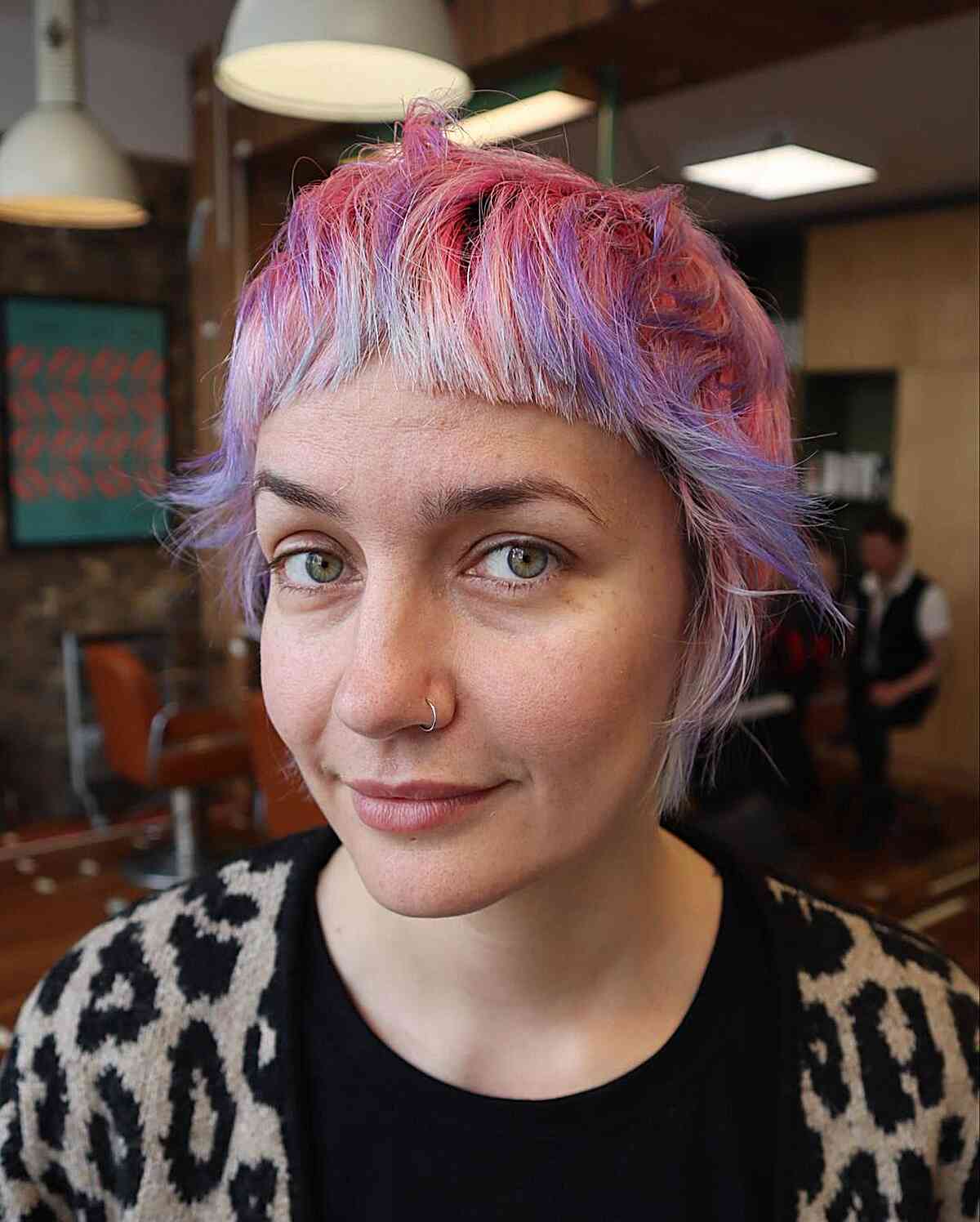 Ask for a short micro-fringed style in pastel pink and purple. When you’re with your stylist and want to incorporate playful colors into your hair, look for ways to enhance your face shape. You can accentuate your features with soft, lighter colors like this delightful pink and purple hairstyle. My suggestion is to choose shades that harmonize with your skin tone and eye color. Even vibrant hues can complement your bold style.