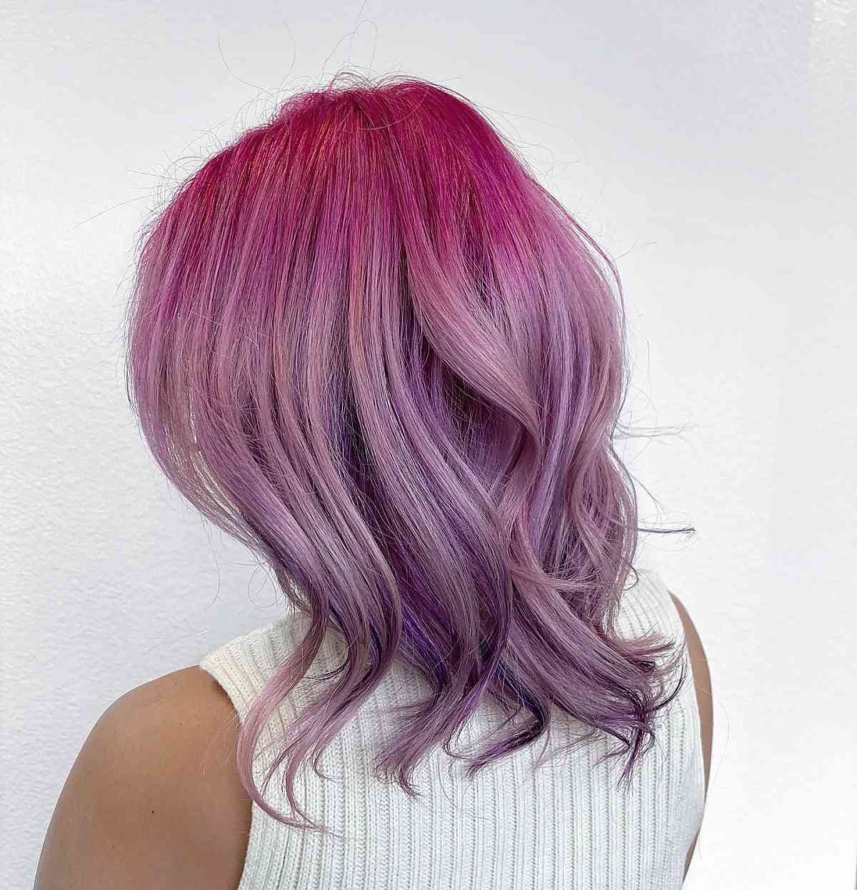 Choosing a more pastel shade, like soft purple with blush pink roots, gives a youthful vibe. Curls add texture to this glorious pink and purple ombre hair.
