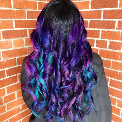This vibrant purple, pink, and blue hair style is bold and edgy with just the right touch of sophistication.