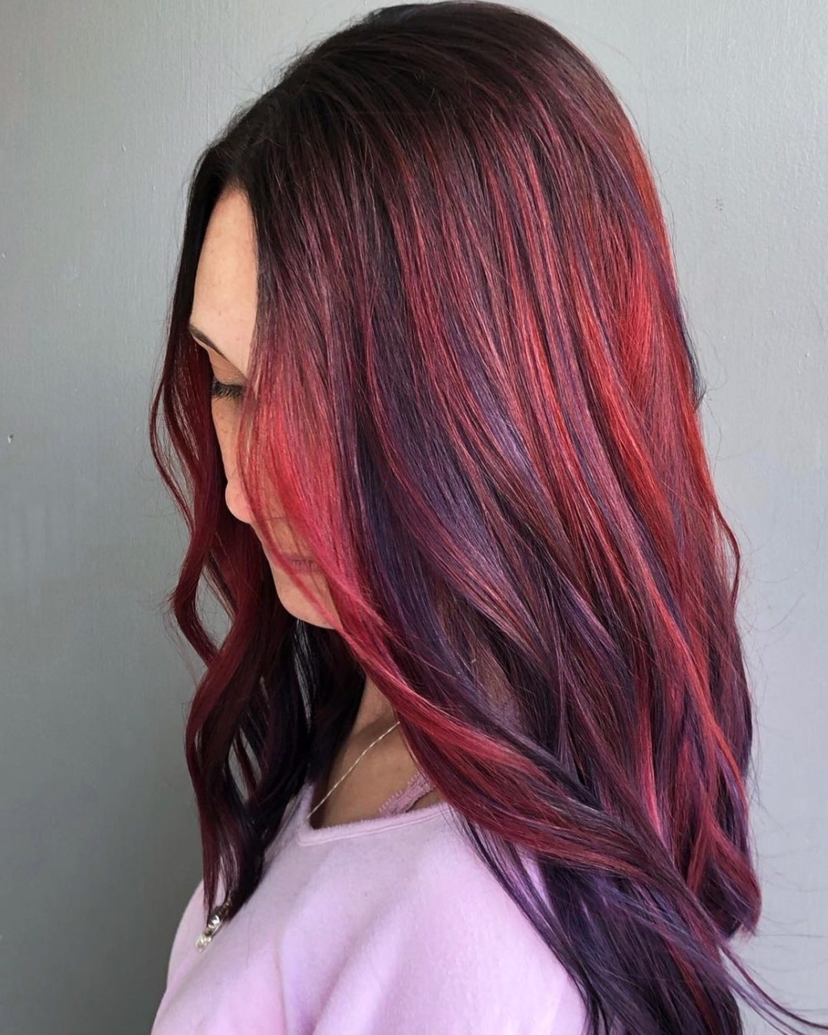 Dark hair with red accents is great for women who want to get red but can’t fully commit to a full redhead. To get this color, ask your colorist to give you some chunky red hair highlights so you can see more pops of red.