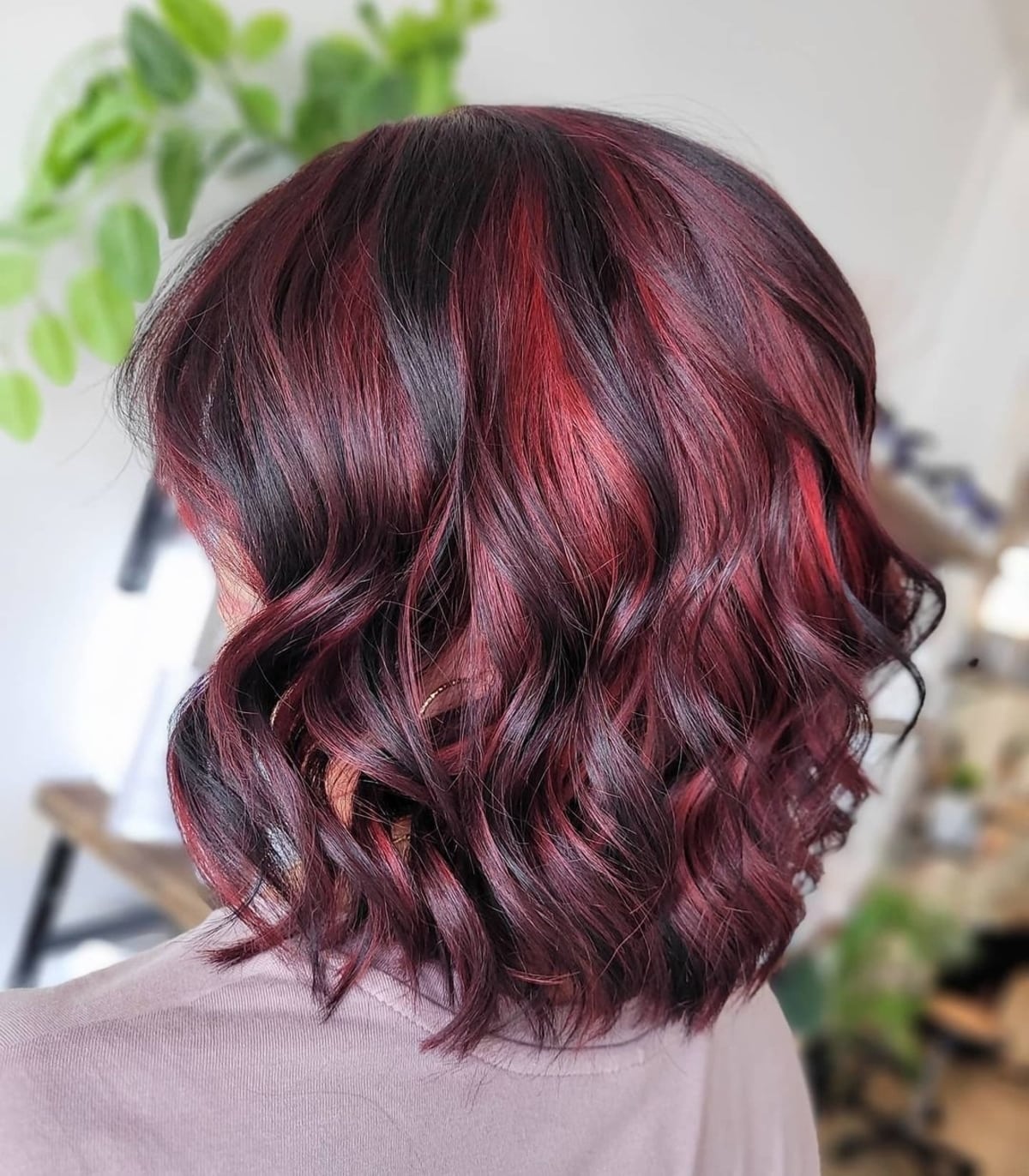 Pair a shattered bob with deep red highlights for a striking autumn look. If you want to add some waves to the bob, have some kind of texture added to the short red hair to hold the curl. It could be a texture spray (like a sea salt spray) or a light-hold hair spray.