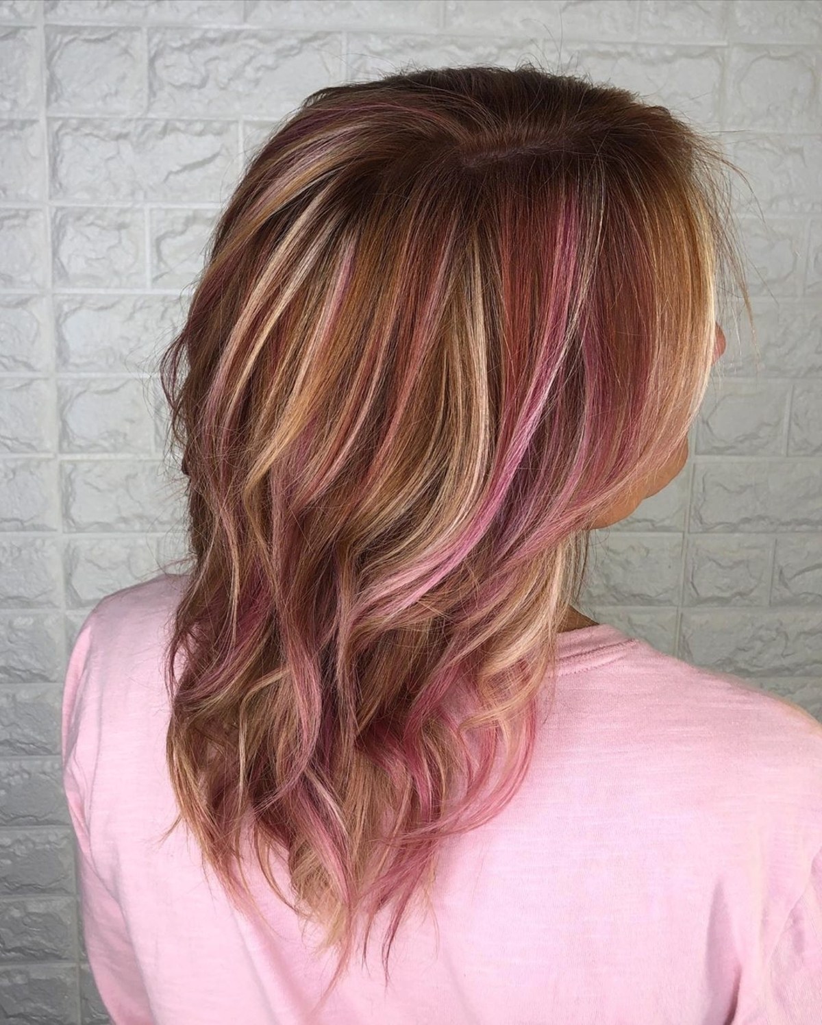 Ginger auburn hair with pink accents shines! The contrasting colors yield a stylish and playful result that’s truly extraordinary. Try it on your mid-length, wavy locks for a stunning hair makeover.