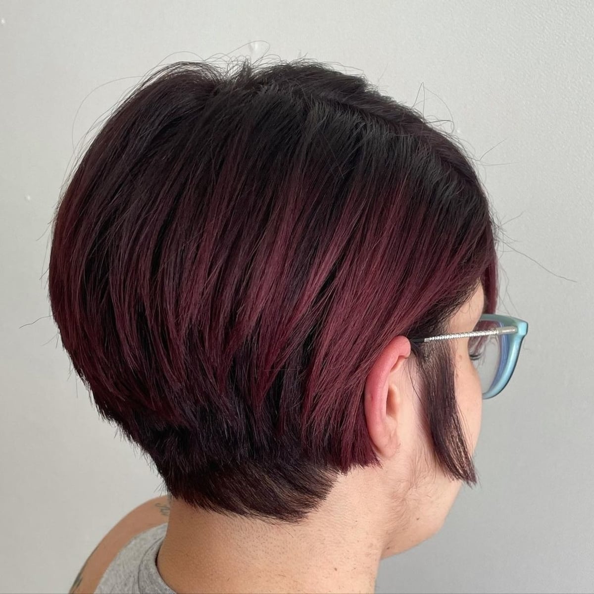 A wine-inspired pixie with highlights is a short-length cut showcasing subtle hints of red. It benefits women seeking a dramatic change or a more manageable style. I used Paul Mitchell’s The Color XG 3VR with 20 volume and Brazilian bond builder on the roots. Then, a 4VR with 30 volume and Brazilian bond builder was used on the ends. I performed the scissor-over comb technique for the chop, then added graduation.