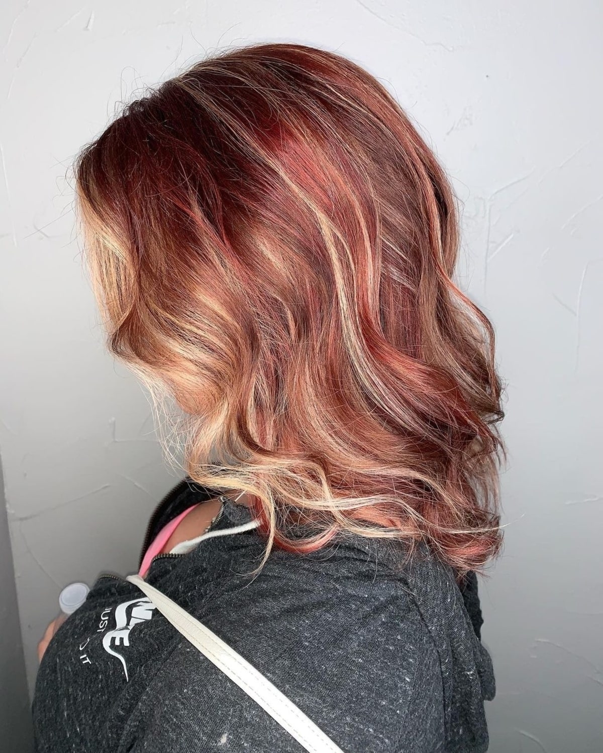 Consider vibrant red hair with lowlights if you want to spice things up! Dare to be different with this fiery red and copper combination. Your stylist will have fun creating this look for you. And if you want more dimension, hear me out, ginger hair with blonde highlights!