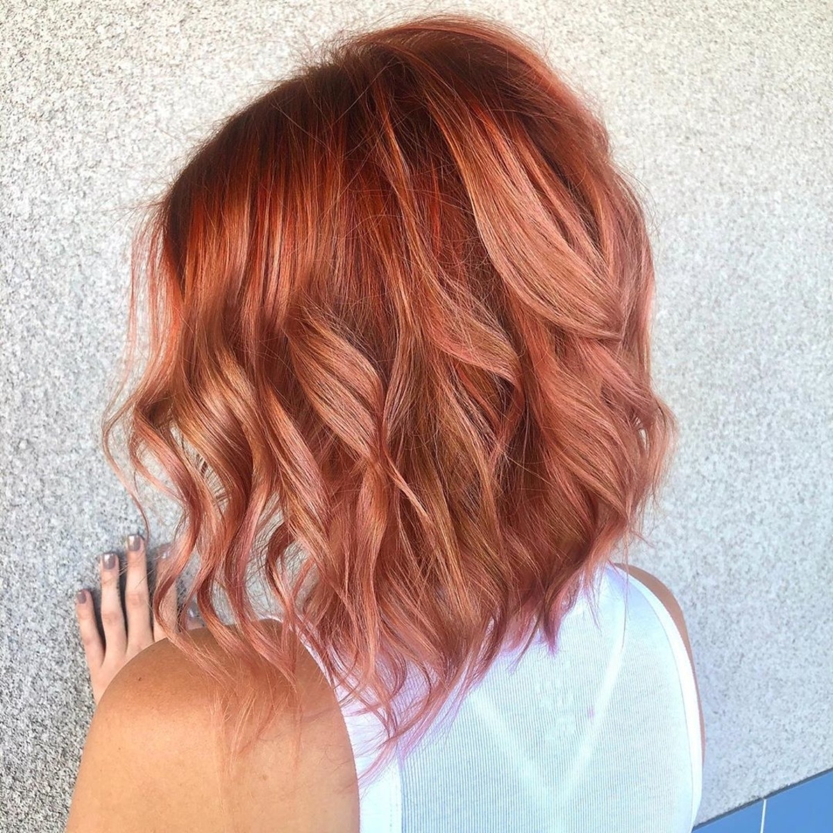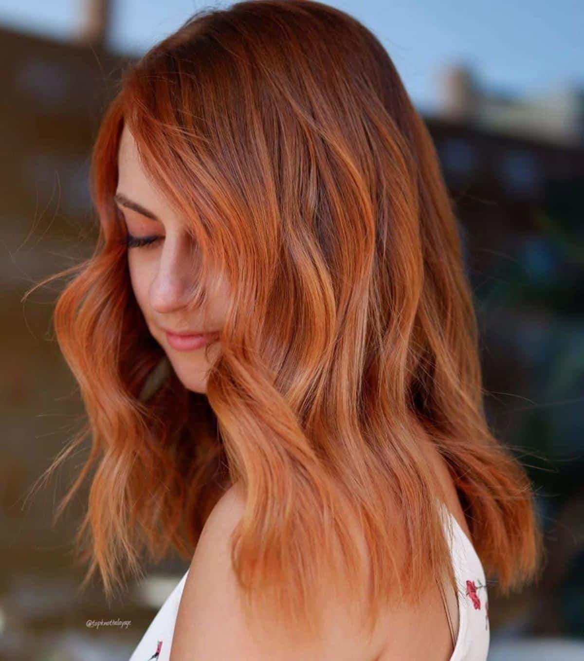Explore a blend of rose gold and ginger tones on a medium-length layered hairstyle. These textured highlights also help frame the face and elevate focus towards the eyes and brows, balancing the shorter length at the front. You can create a similar vibrant look with a fresh cut and color on auburn hair featuring copper highlights.