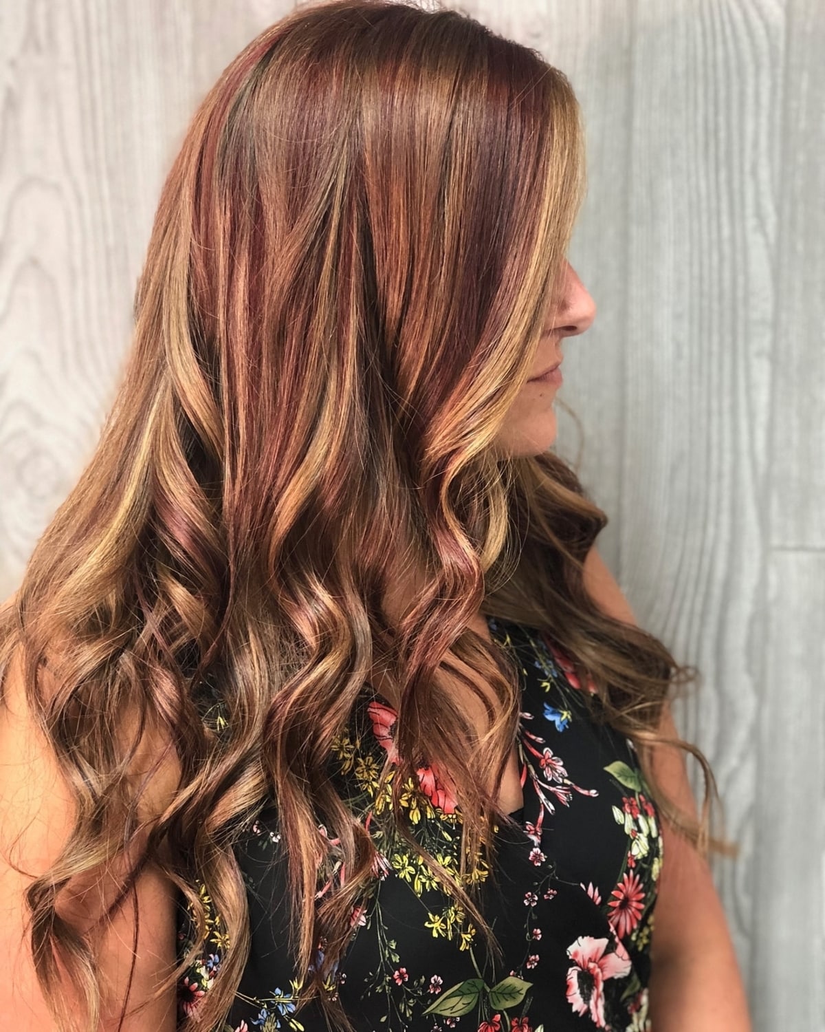 Luminous red and deep brown hair with highlights is always a perfect choice if you have warmer skin tones. The striking red and copper hues will enhance any season. Your hair will look stunning whether styled straight or with curls. You will love the results!