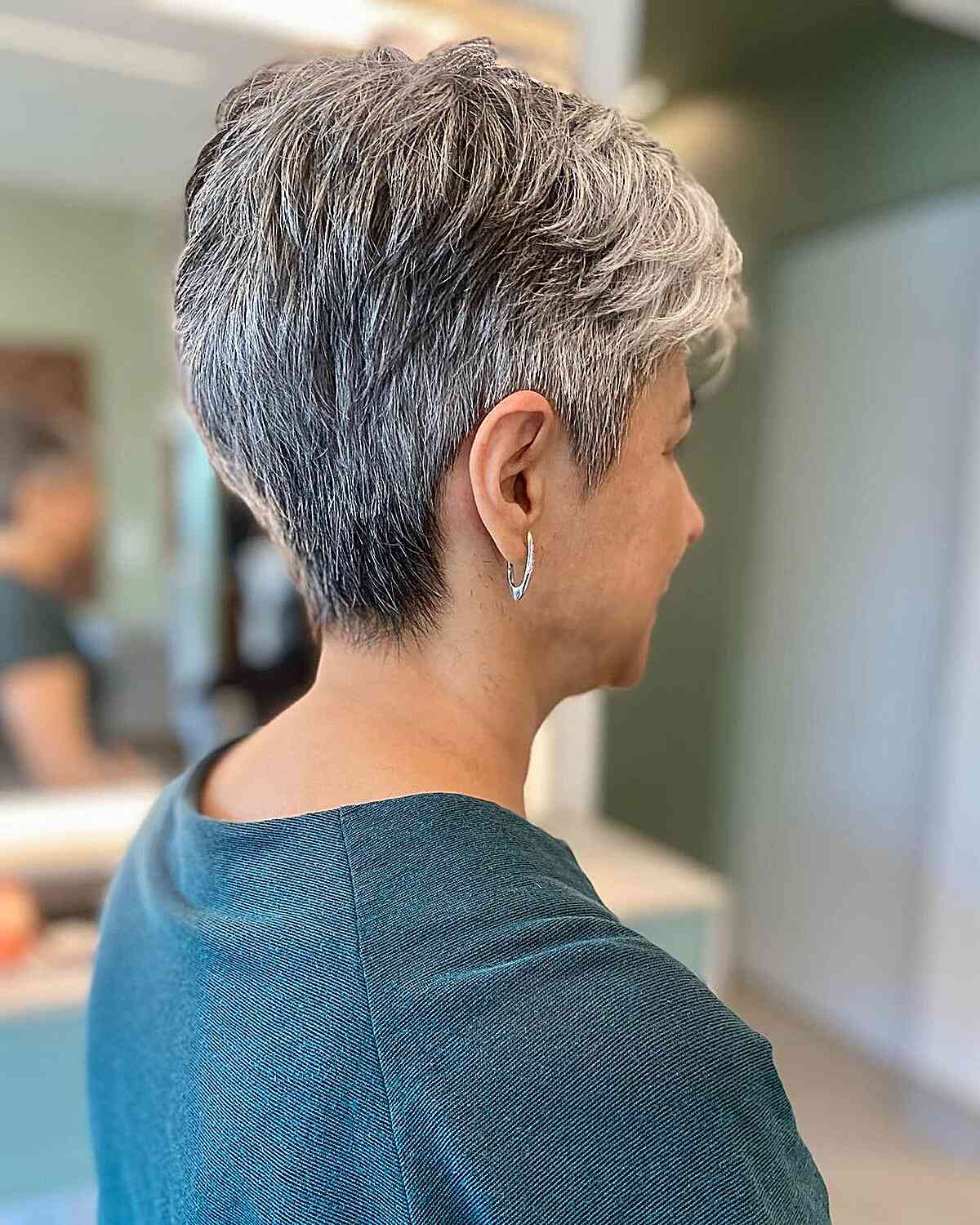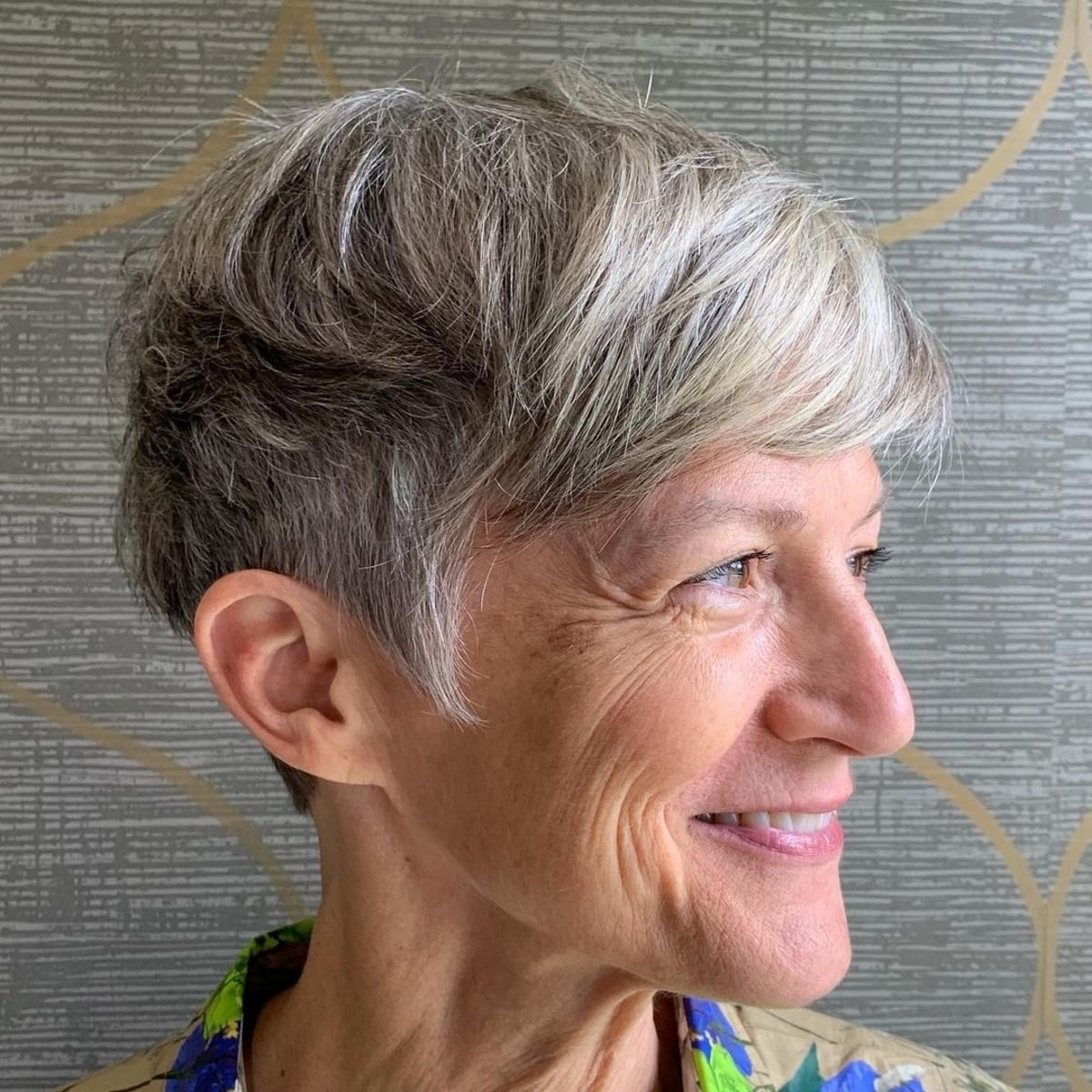 If you’re a woman over 60, a salted and peppered hair color can be styled in a chic and contemporary manner. Women in their 60s should think about trying a playful, edgy pixie cut that embraces their natural hair color. It enables you to achieve a youthful appearance while enjoying a fashionable, low-maintenance haircut simultaneously.