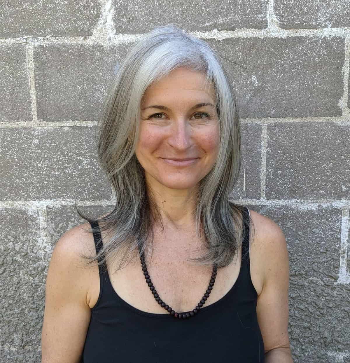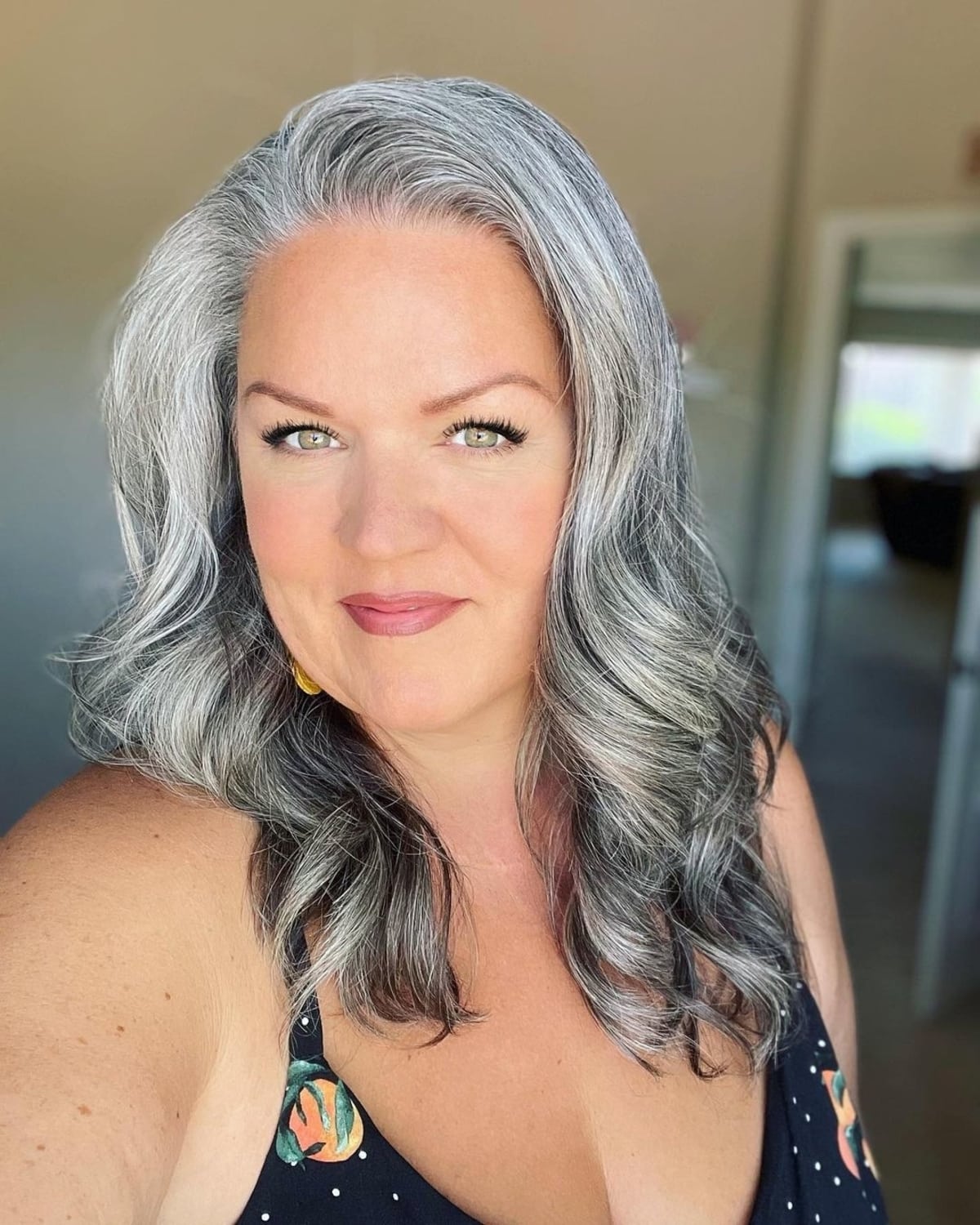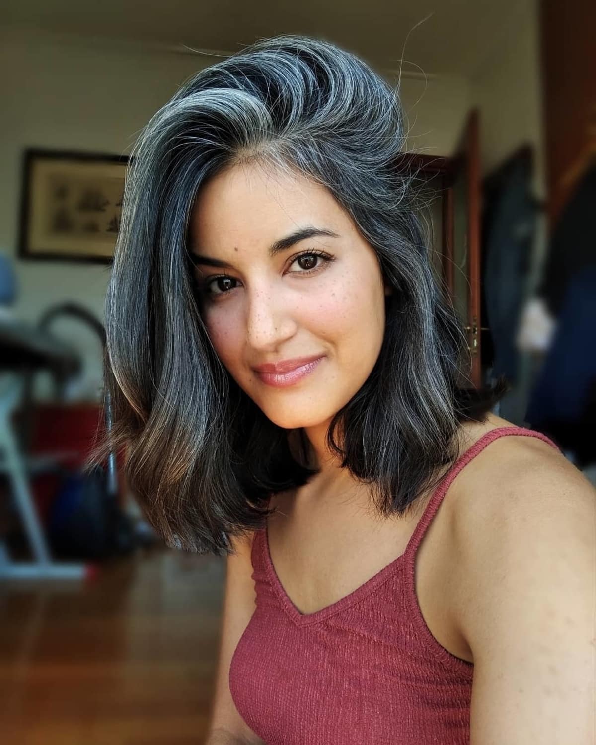 Silver hair color for medium-length styles is currently trending and wonderfully low-maintenance. Salt and pepper hair features grey highlights that shine with a rich, dark base that stands out. A shoulder-length cut with plenty of layers simplifies styling and allows for a “wash and go” look.