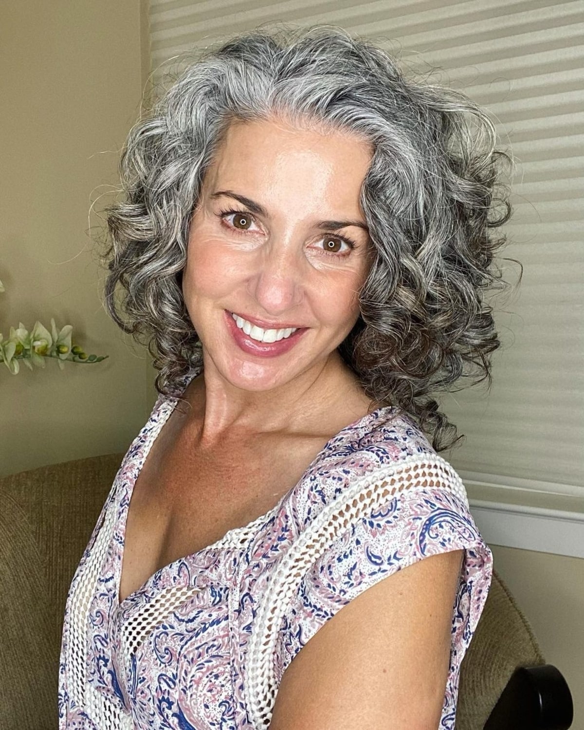 Salt and pepper hair colors with dark undertones provide stunning contrast and dimension to your hair color. Ask your stylist to create a money piece in your hair by lightening and toning the face-framing layers while leaving depth. Embracing your salt and pepper curly hair is liberating and freeing.