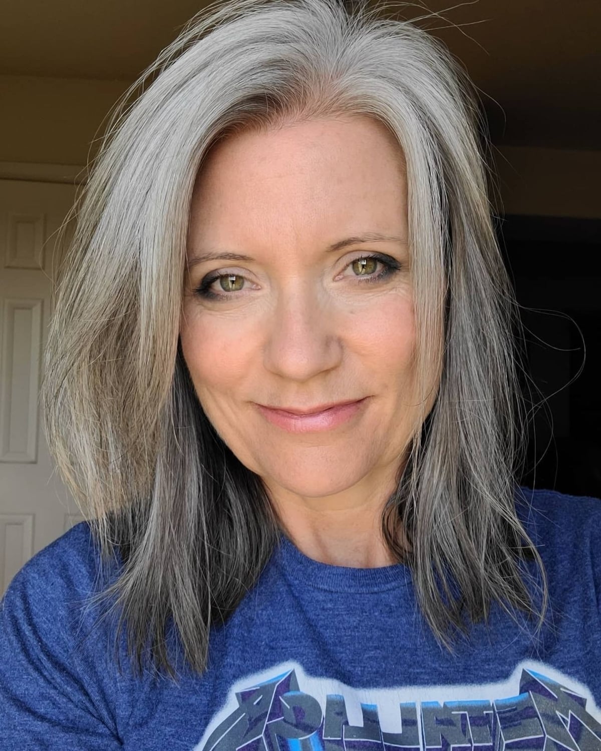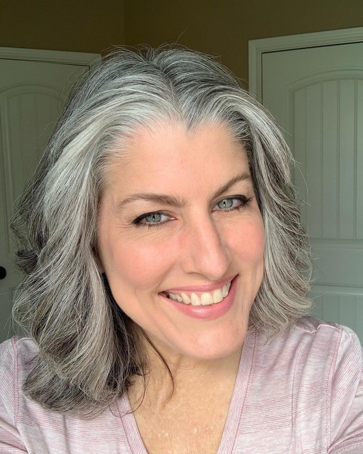 If you’re a woman over 50, embracing salt and pepper hair adds a vibrant twist to your look. Just as hair color evolves, skin tone changes, too. The cooler hues in the grays can enhance your skin’s radiance. You will need a purple shampoo to safeguard your hair from sun exposure, mineral or product buildup, and even hard water when managing salt and pepper-colored hair.