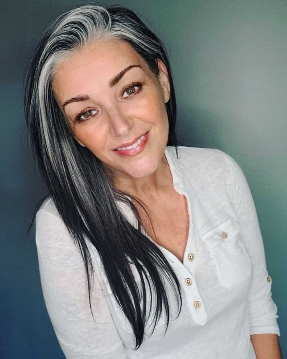 Consider opting for salt and pepper hair if you desire a natural appearance. Incorporating platinum highlights alongside deep, rich lowlights will bring instant brightness to your hair color! This hue is ideal for seamlessly blending in your natural grays.