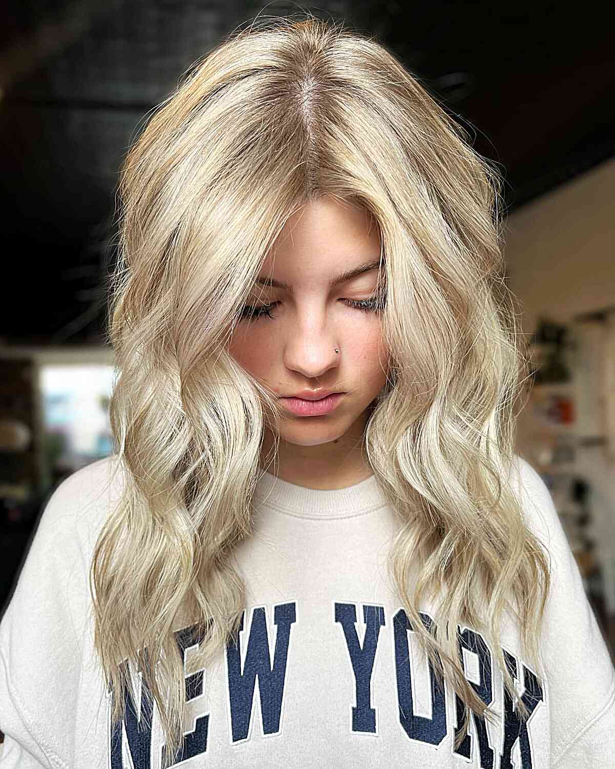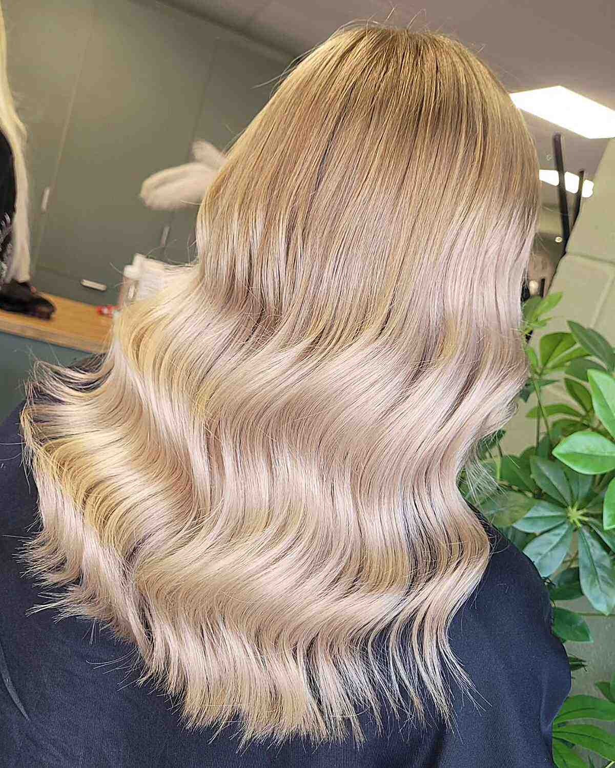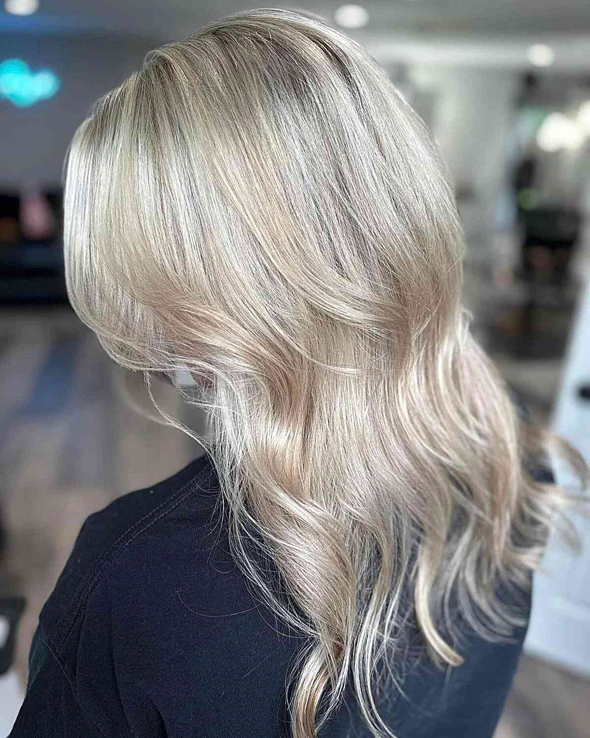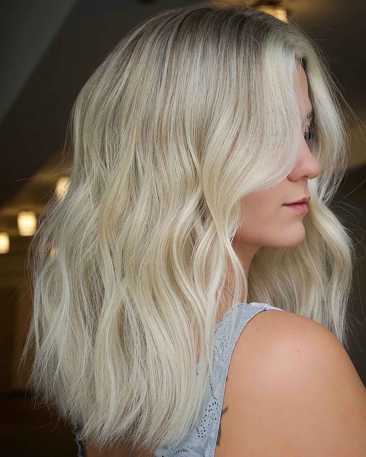 Champagne blonde with a platinum touch is a balanced blend of bright, icy, smooth blondes. This shade often complements cooler complexions best. Achieving this look requires extra upkeep, as the growth line becomes noticeable fairly quickly.