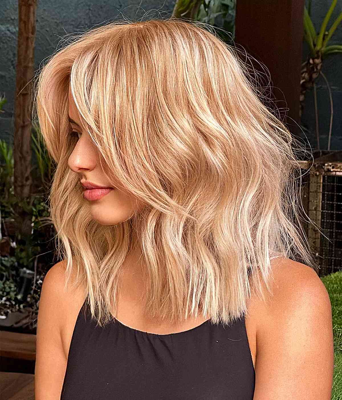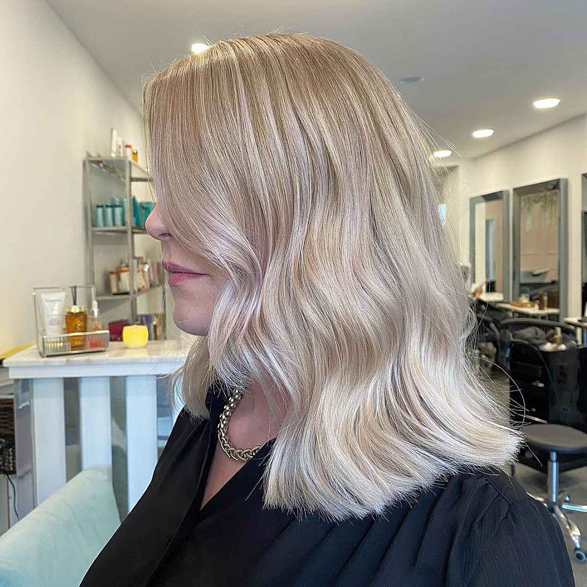 This effervescent blonde is an excellent option for women with mid-length hair who desire a lustrous finish to their blonde, almost shimmering appearance.