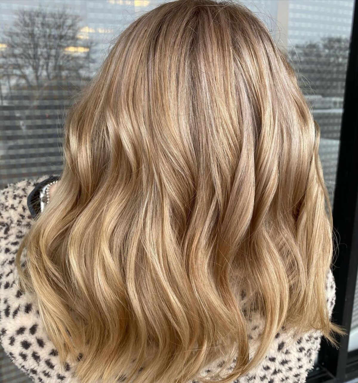 To add depth, a rich champagne blonde is elegantly blended with a few lighter strands. Champagne blonde is ideal for women desiring a subtle, more effortless change in their hair.