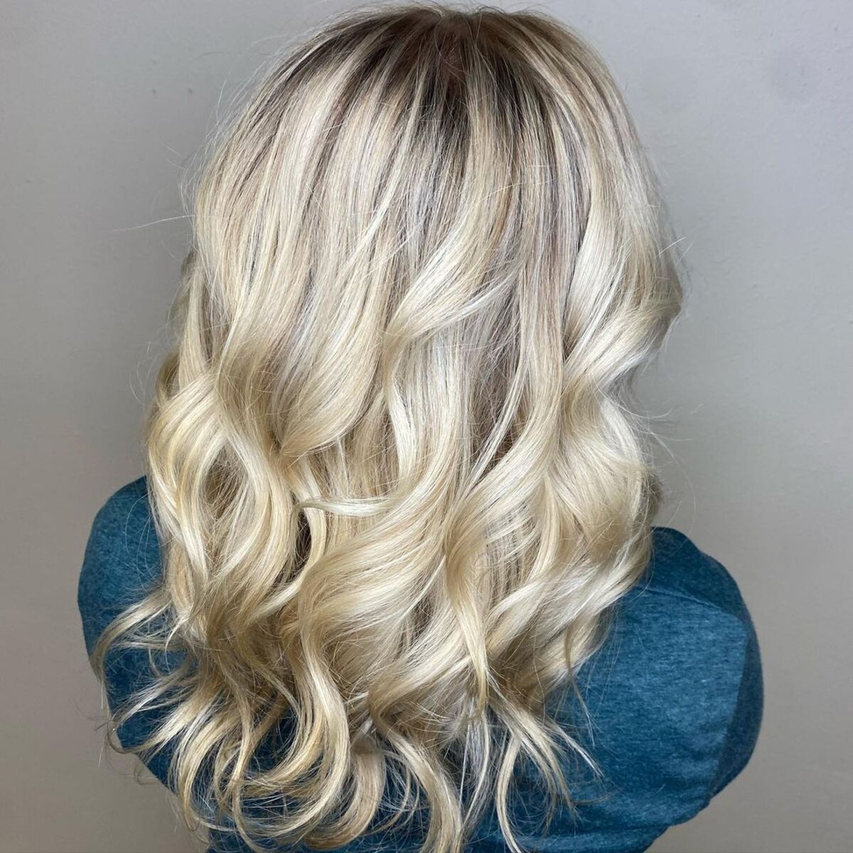 To achieve this style, you can either apply Global Blonde and bleach all your hair, or you might have been highlighting it for several years until it has become completely blonde. Regardless of the method, adding champagne lowlights of level 8 or 9 will add dimension to the blonde color and create golden highlights. This gives your blonde hair an exquisite and tasteful look. Maintaining this hairstyle requires a high level of care, but it’s worth it if you can invest the time and resources.