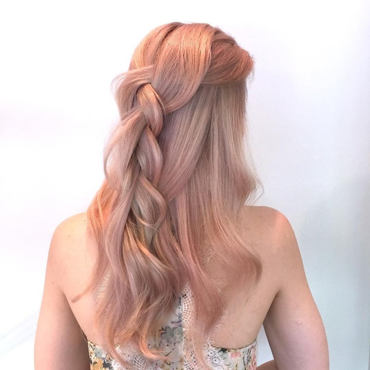 A champagne pink blonde hair gives off a very feminine vibe. The shade works on straight hair with slight waves. Achieve a romantic look by styling it with a braided half updo.