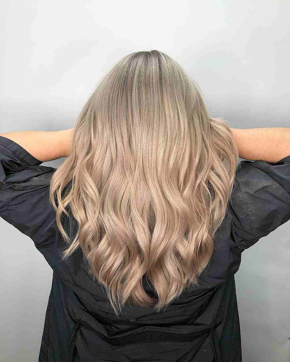 Consider trying a soft champagne blush blonde with a long haircut. The pastel pink undertone looks elegant on women with light skin tones. This champagne blonde hair dye appears adorable with a straight style and glamorous when styled wavy.