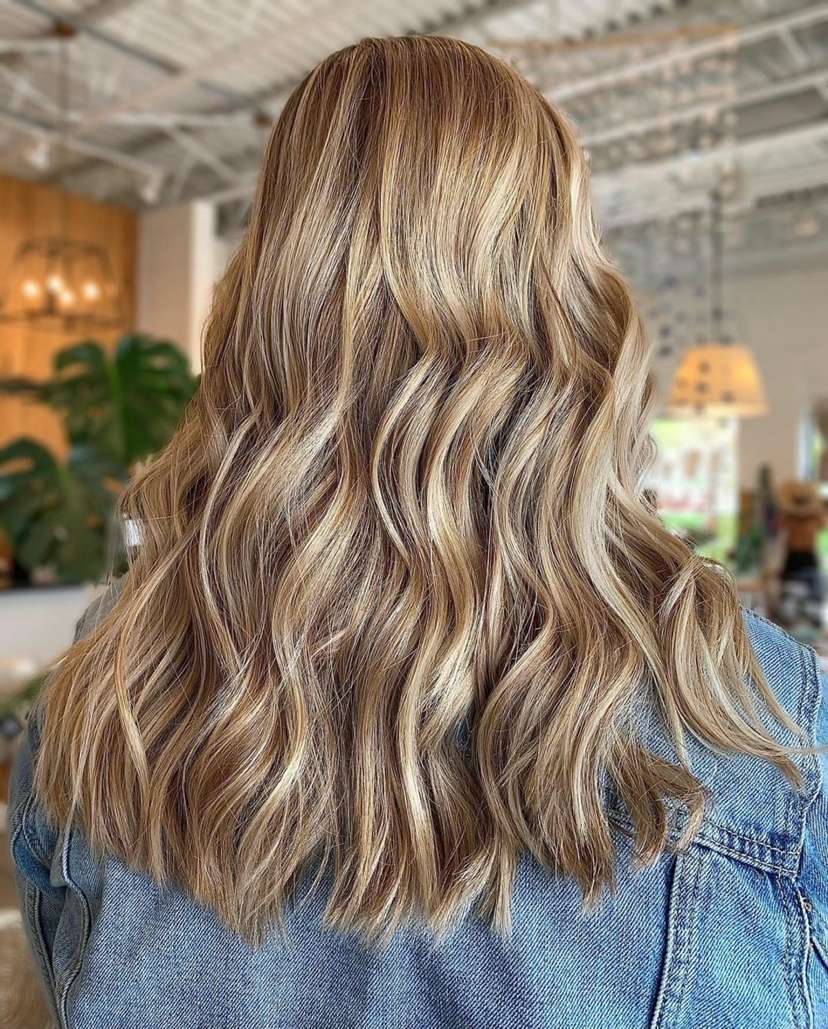 Champagne blonde lowlights with a shadow root allow for a natural glow and effortless upkeep. Champagne lowlights are soft and creamy. If you desire dimension, ask your stylist to add some lighter strands for a stunning pop you’re aiming for!