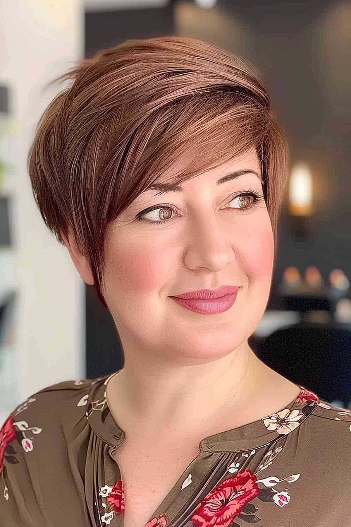 Chic and sassy, this short hairstyle for round faces is ideal for women who love a bit of flair. The asymmetrical pixie frames your face with textured layers, making those chubby cheeks appear effortlessly sleek. Its height at the crown stretches the profile, while the side-swept bangs draw attention to your eyes. A breeze for upkeep, though a tad of styling is needed to keep that top volumized. It’s a spirited choice for straight hair, giving a round face that desired sharpness!