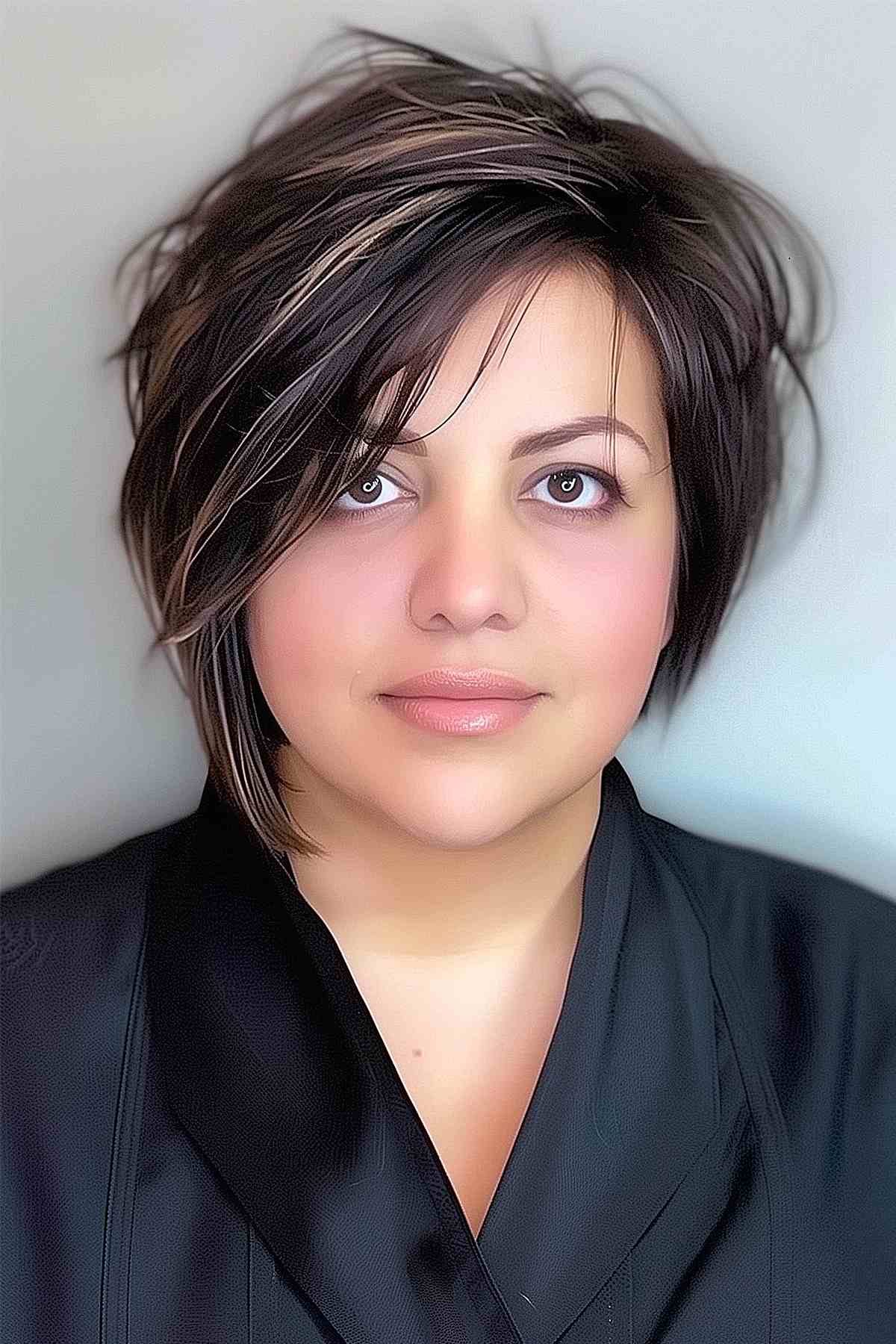 An effortless pixie bob for plus-size women is among the top choice hairstyles. A pixie bob enhances facial features and sculpts the jawline. Think about adding dimensional honey-blonde highlights to elevate this haircut.