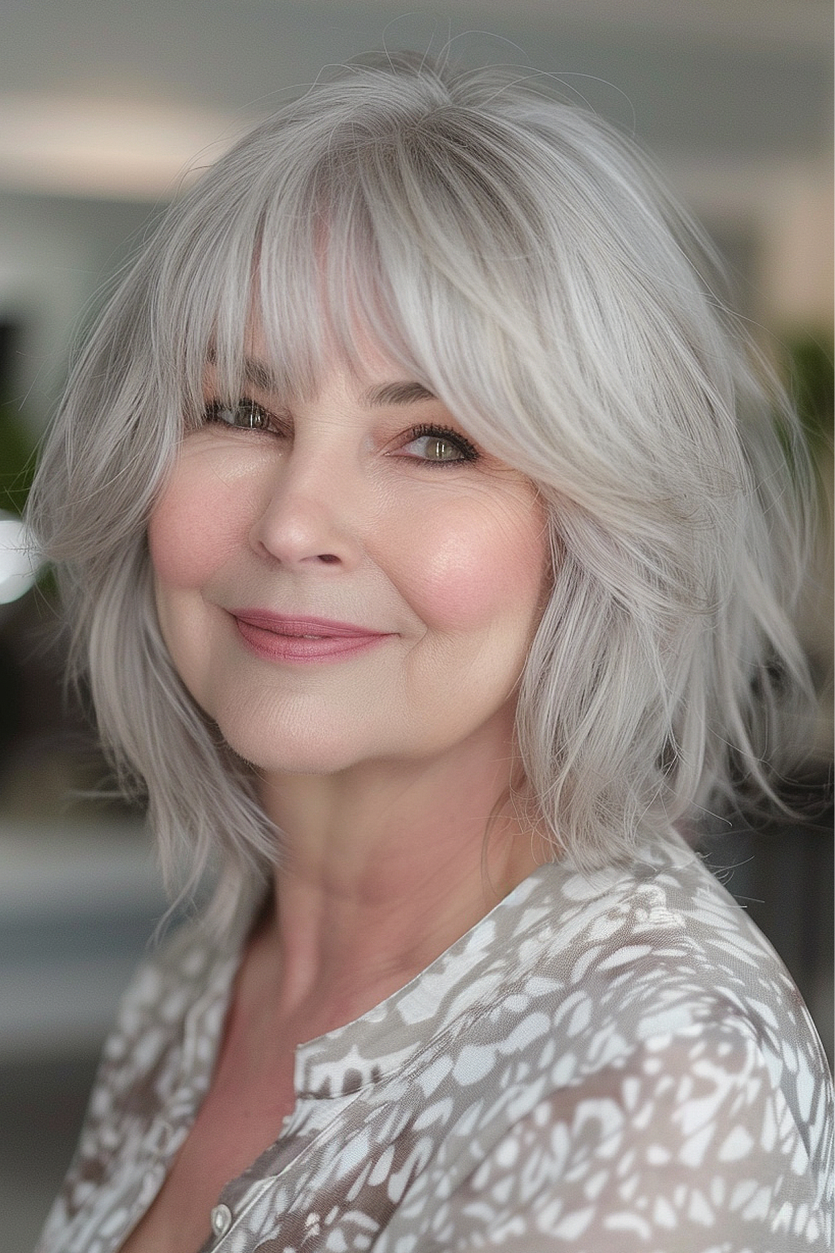 This chic layered bob for women aged 60 and above is a stylish and flattering option, especially for those with fuller cheeks. The gentle layers provide volume and movement, while the fringe nicely frames the face and highlights the eyes. This haircut is ideal for fine to medium hair types, offering a youthful and fashionable look. The layers minimize bulk and give a light, airy vibe, making it simple to maintain and style.
