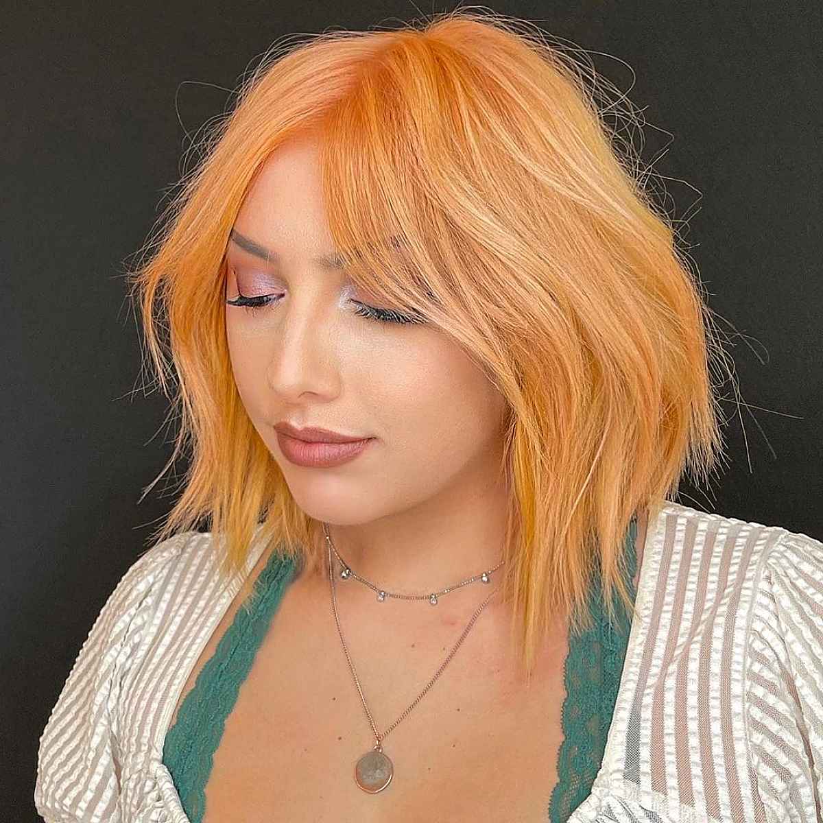 Achieve a stunning look with this elegantly designed collarbone-length haircut. If you aim to highlight your facial features, an angled forward center-parted bob is essential. This gorgeous honey-coral copper hue perfectly enhances the striking appearance.