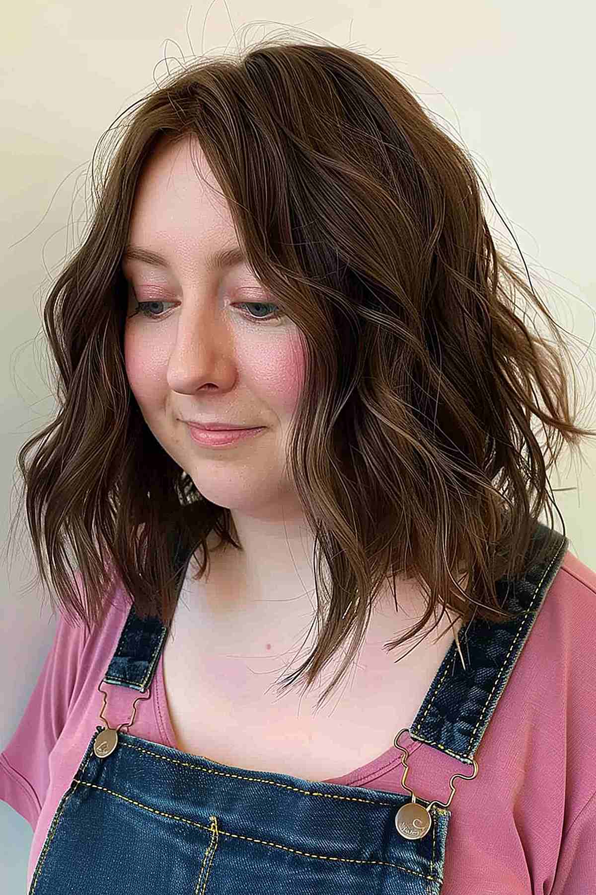 This medium-length cut features soft, wavy layers that add movement and texture, ideal for those with medium to thick hair density. The subtle highlights enhance the layers, creating depth and dimension. This style beautifully frames various face shapes, especially oval and round. For styling, a light mousse or sea salt spray can define waves while maintaining a natural finish. This versatile look is perfect for everyday wear and can easily transition from casual to more polished settings.