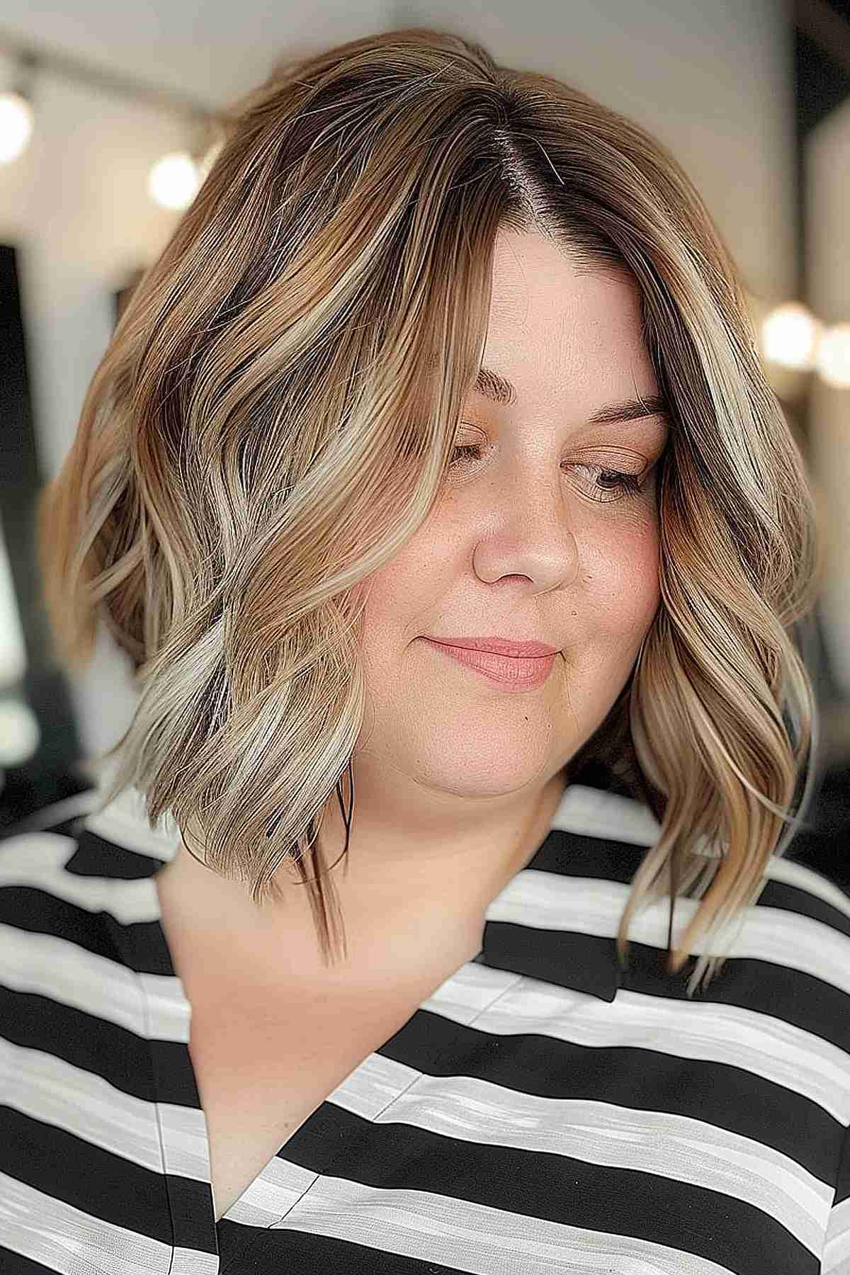 Looking for a fashionable change? This stylish medium-length bob is tailored for women with a double chin, featuring soft waves that create movement, complementing fuller facial features. The strategic balayage adds depth and dimension, brightening the face without overwhelming it. Ideal for those with straight to wavy textures, it allows your natural hair to enhance the cut’s shape. Keep in mind, the color needs maintenance to avoid a dull look, and the layers require styling to maintain their swing. A blend of casual elegance and easy upkeep!