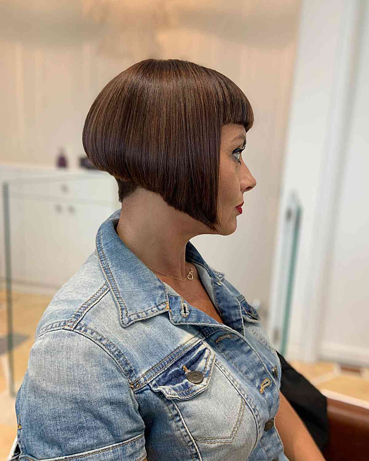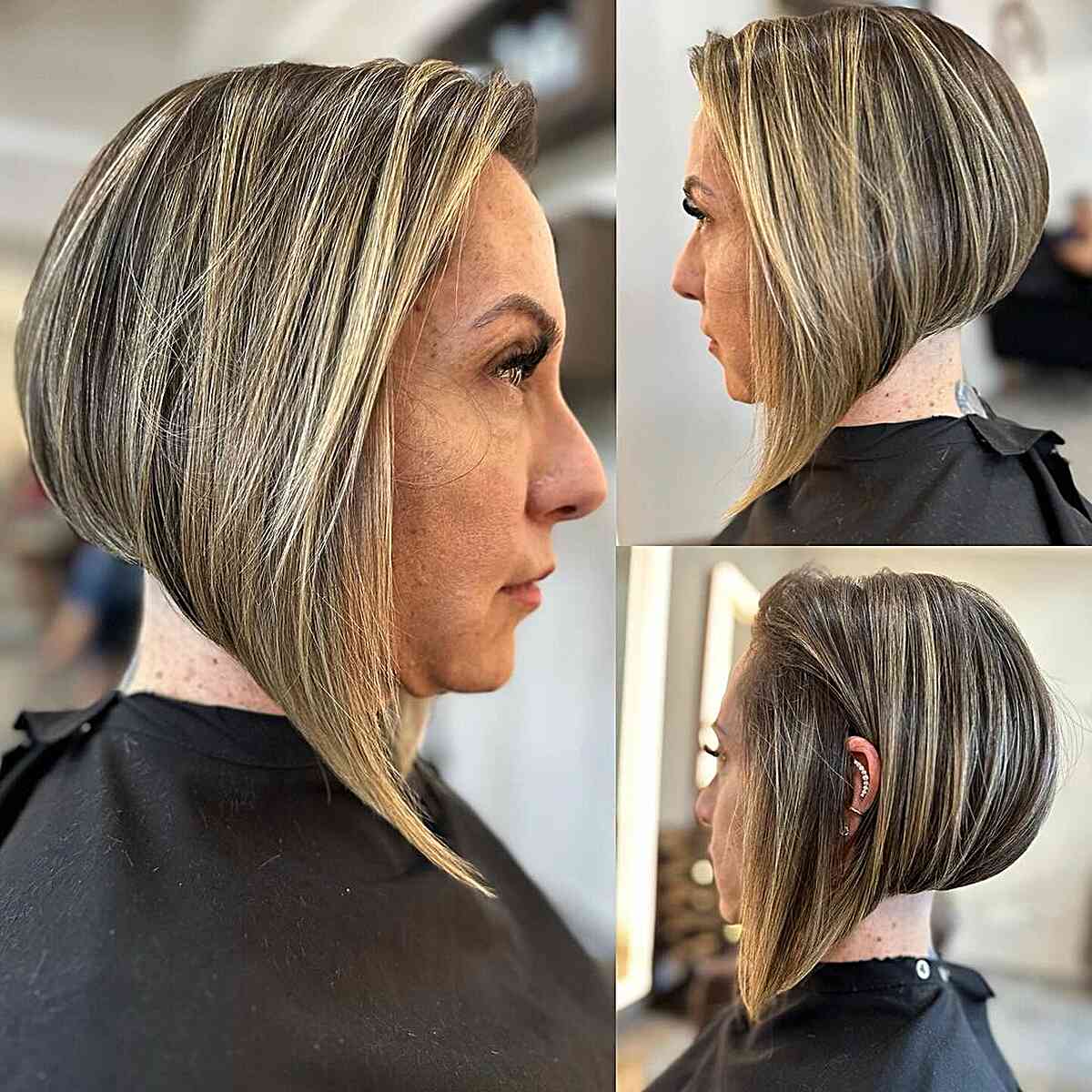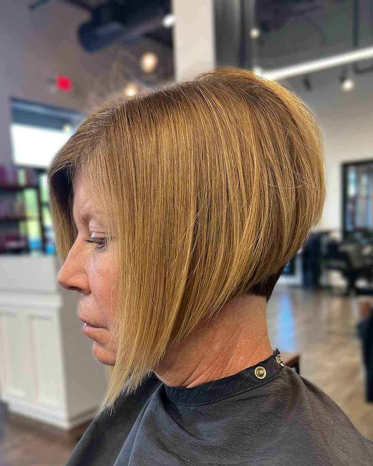 This hairstyle showcases a stunning asymmetrical A-line bob with an undercut, perfect for women with shorter hair. This type of bob is fashionable, modern, and striking. Ensure your stylist understands your hairline, as over-layering without careful consideration can lead to unwanted gaps, holes, and an overly choppy look instead of a polished finish.
