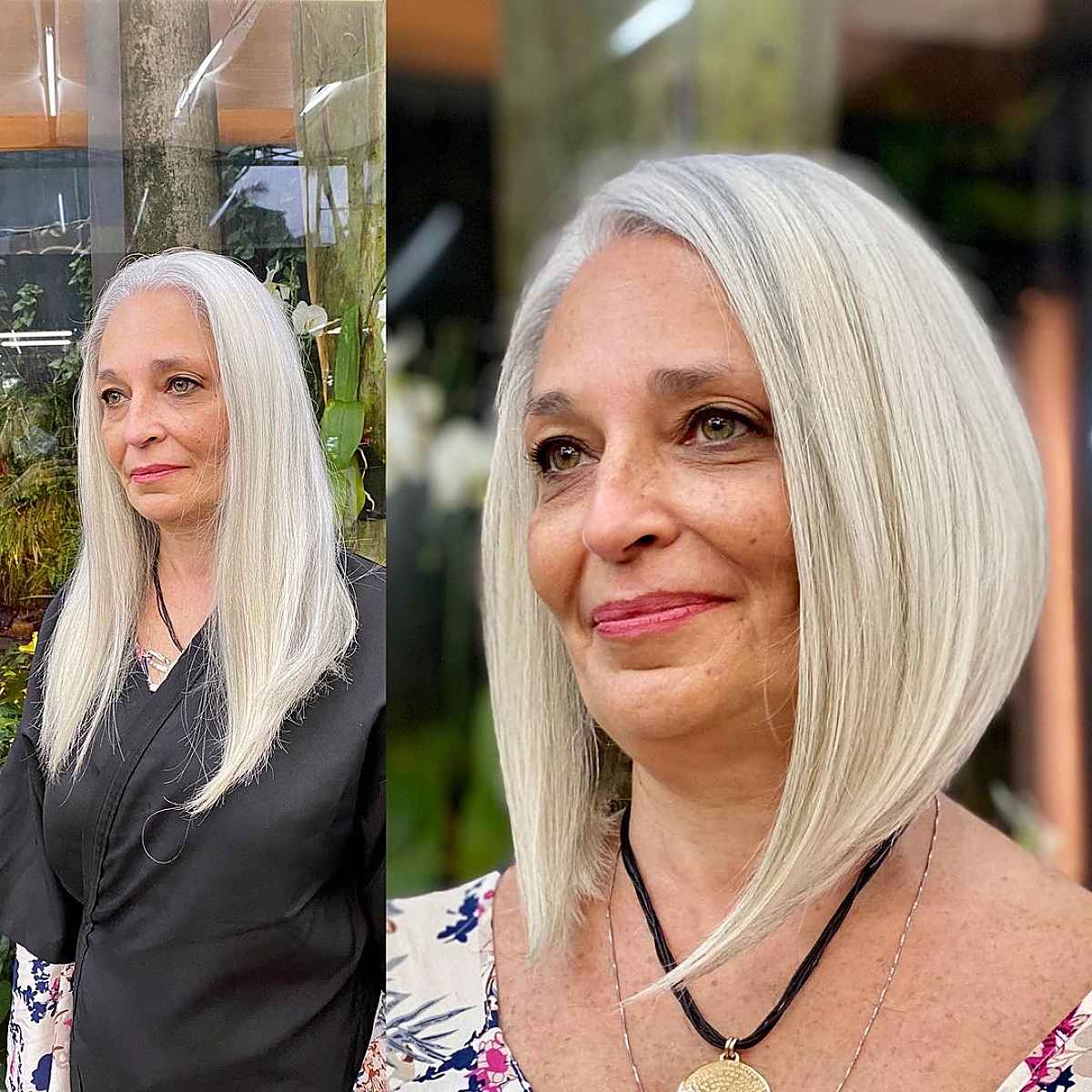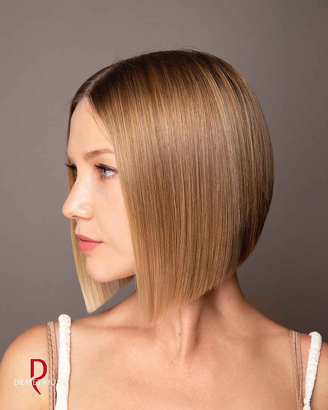 A boldly angled blonde a-line bob is a captivating style that you will want to explore. If you desire to see a strong, edgy bob line, I suggest very minimal layering. Maintaining the weight of your hair will enhance the bottom’s prominence. If you attempt to recreate your shape and require assistance, remember to hold the bottom line straight out – not turned under. You can also utilize a flat iron to achieve a straight edge.