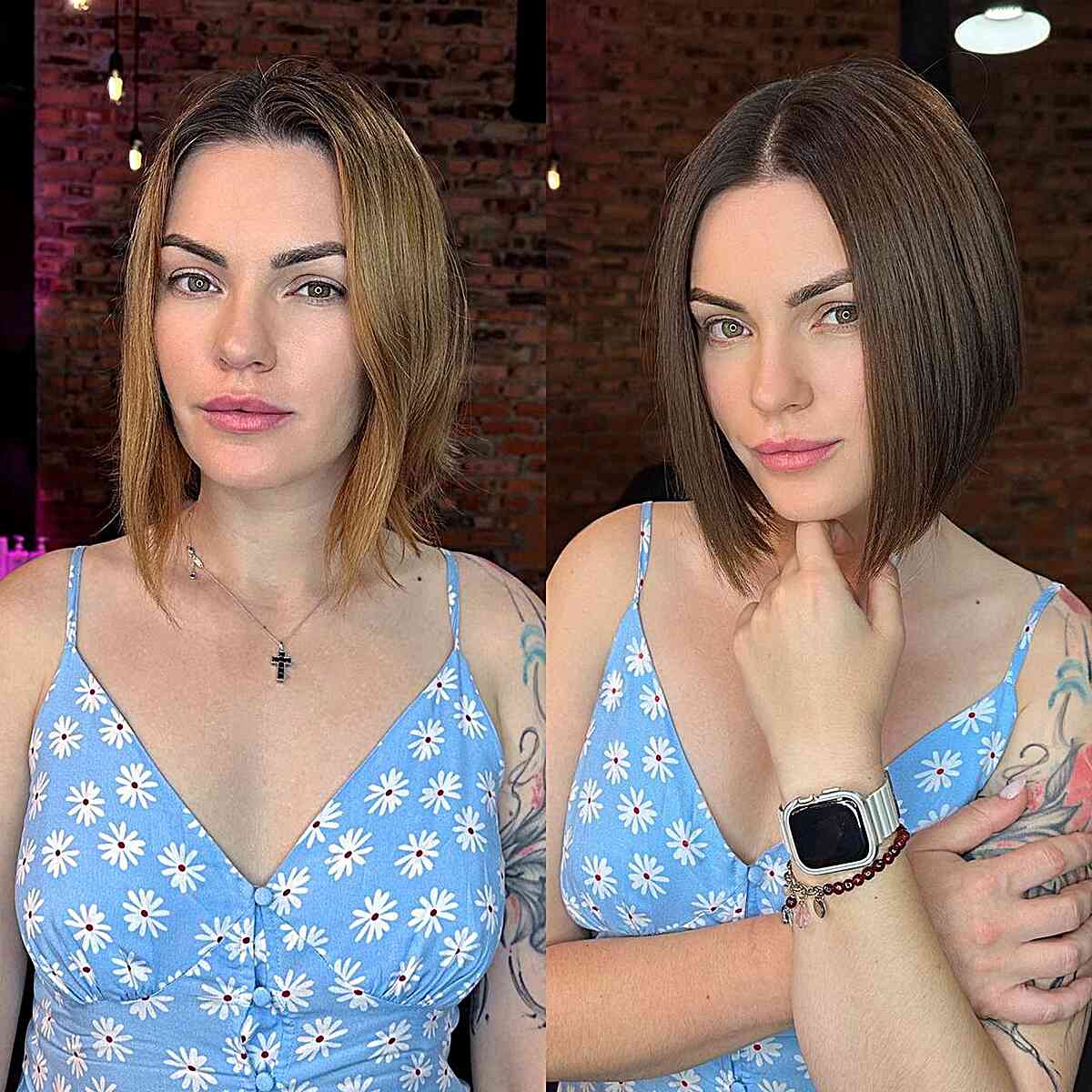 This short and straight haircut offers a timeless look. Consider requesting blonde highlights through traditional foil techniques for added flair!