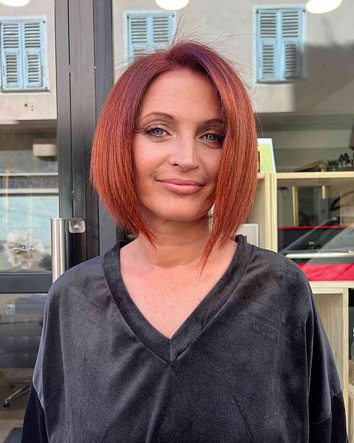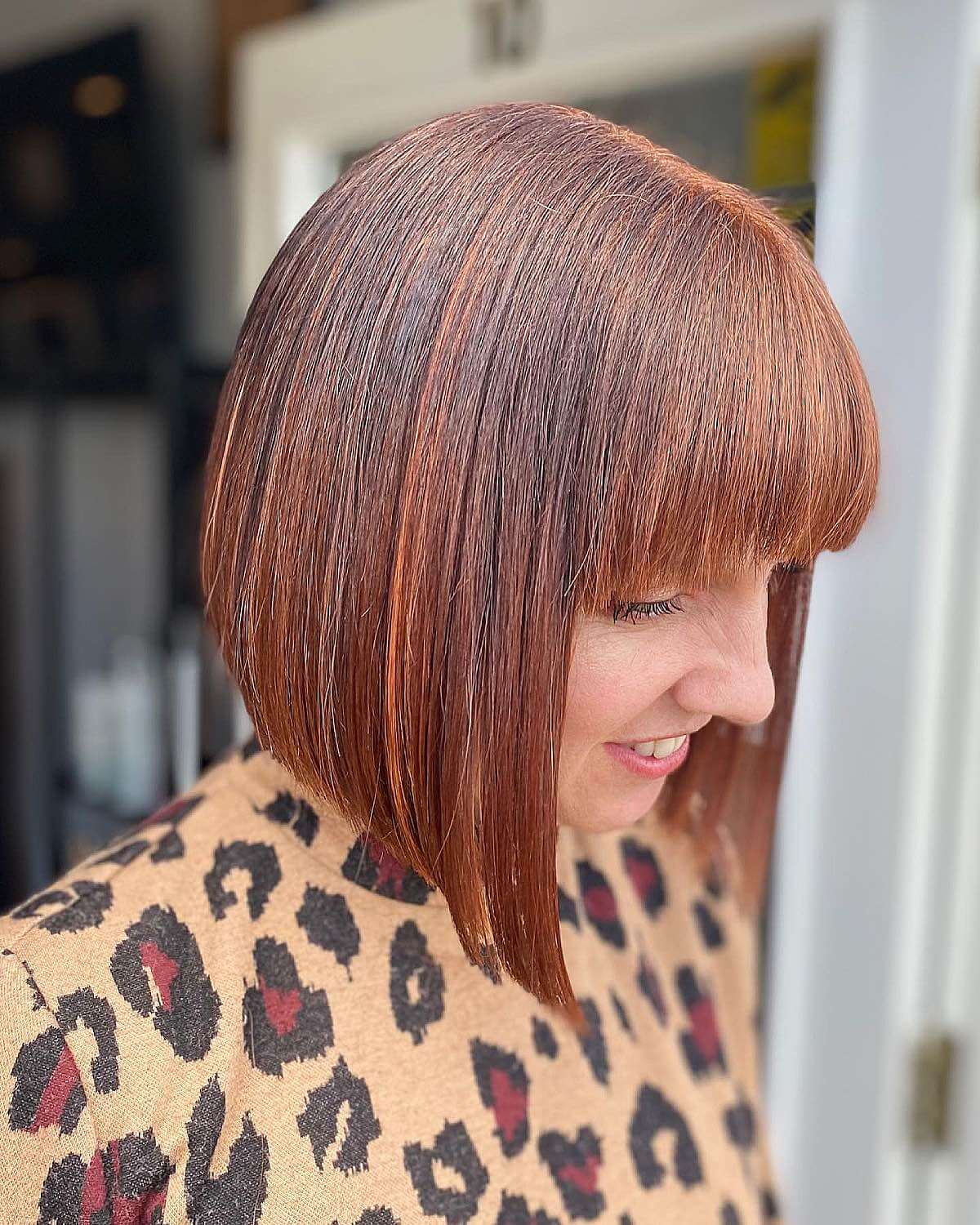 A chic copper a-line bob with fringe is a timeless style that feels updated when enhanced with striking copper tones. The sharp, smooth line resting above your shoulders is a bold look that will captivate everyone as it sways with you, particularly when complemented with copper shades.